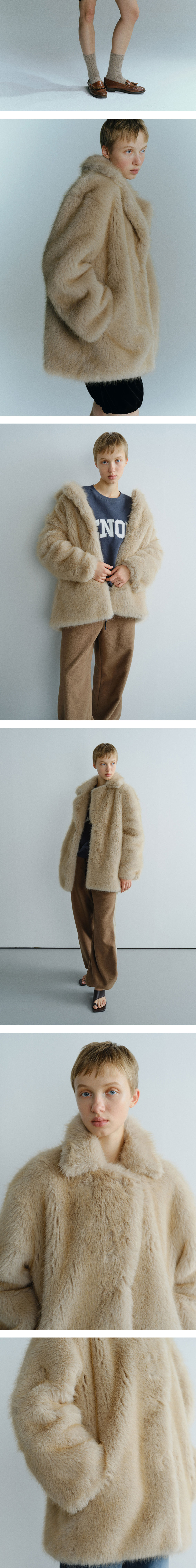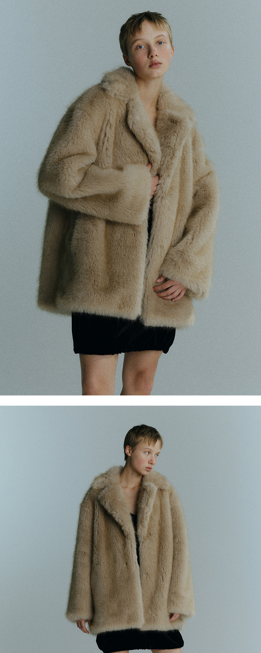 - 오버사이즈 실루엣의 인조 폭스 퍼 코트입니다. - 헤어리 한 퍼 소재로 캐주얼과 페미닌룩 모두에 자연스럽게 어울리며 스타일링의 완성도를 높여줍니다. - 전면 걸고리 모양의 클립 클로저로 안정적인 클로징이 가능합니다. - 카라 부분 후크 디테일로 오픈 시 재킷 스타일, 클로징 시 블레이저 카라 스타일로 연출할 수 있습니다. - 2개의 심포켓과 포켓 내부 기모 안감으로 실용성과 보온성을 더했습니다.