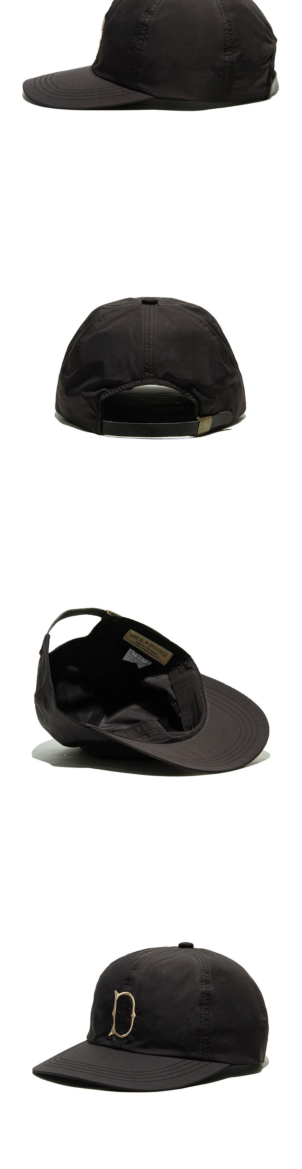더 H.W. 도그 앤 코 유니온 캡 블랙입니다. - 전면 D 로고 자수 포인트 - 낮은 크라운과 곡선형 챙으로 자연스러운 핏 - 생활 방수 기능과 가벼운 착용감 - 매트한 광택의 평직 실키 텍스처 - 폴리에스터 타프타 소재 - 6패널 볼캡