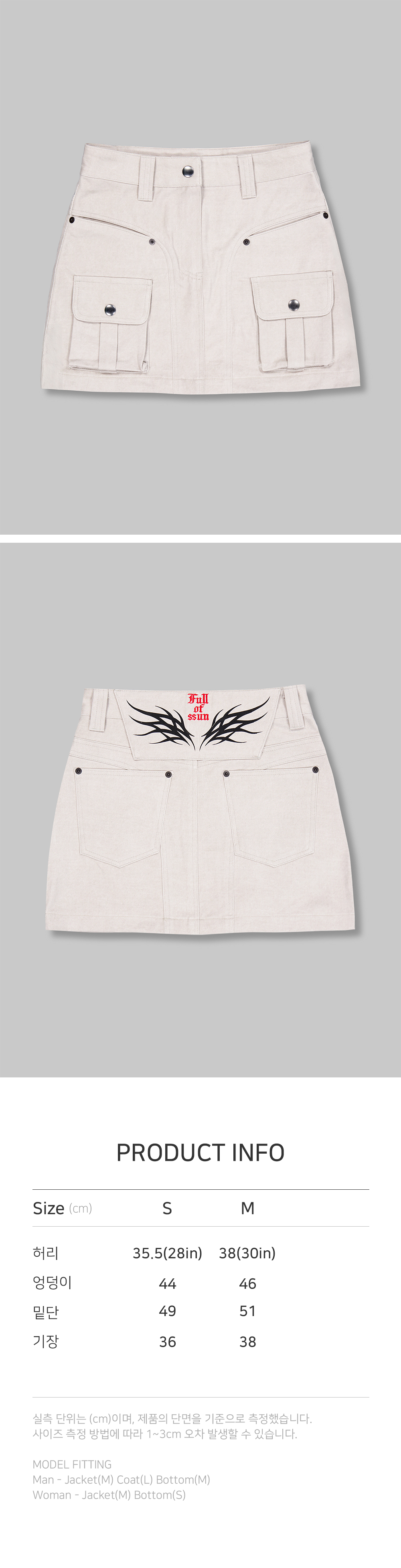 주문제작 상품으로 주문 후 5~7일 후 순차 발송됩니다 (주말, 공휴일 제외) - 아이코닉한 커브 절개 디테일이 들어간 미니스커트입니다. - 뒤판 "Tramp Stamp" 프린팅 FULLOFSSUN 로고 자수 패치 - 피치가공된 원단을 사용하여, 빈티지한 무드를 가미하였습니다. - 입체포켓 디테일 - YKK 바지지퍼 및 스냅단추, 리벳 부자재 (제품 색상은 모델컷이 아닌 제품컷의 색상이 실제색상과 더가깝습니다)