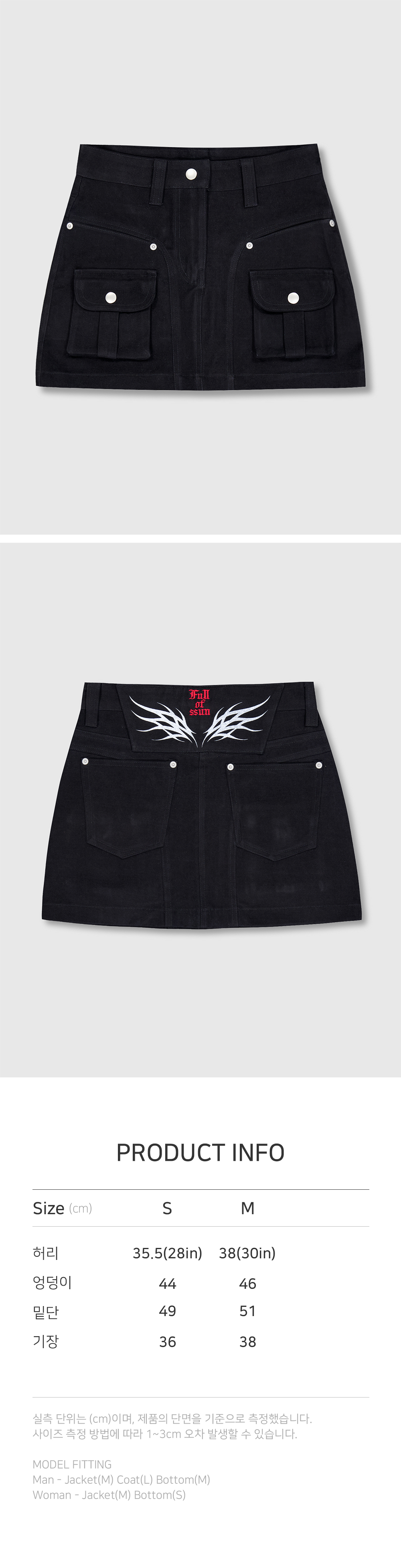 주문제작 상품으로 주문 후 5~7일 후 순차 발송됩니다 (주말, 공휴일 제외) - 아이코닉한 커브 절개 디테일이 들어간 미니스커트입니다. - 뒤판 "Tramp Stamp" 프린팅 FULLOFSSUN 로고 자수 패치 - 피치가공된 원단을 사용하여, 빈티지한 무드를 가미하였습니다. - 입체포켓 디테일 - YKK 바지지퍼 및 스냅단추, 리벳 부자재 (제품 색상은 모델컷이 아닌 제품컷의 색상이 실제색상과 더가깝습니다)