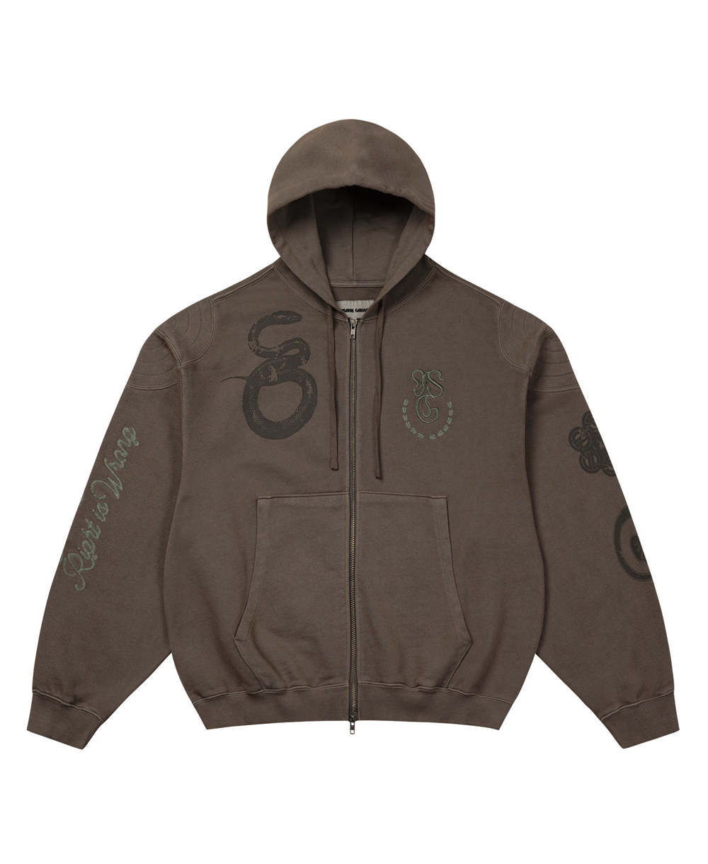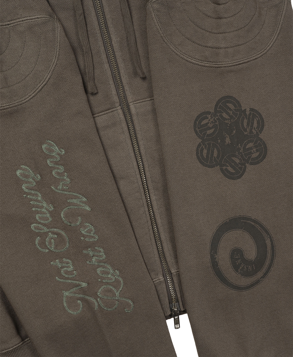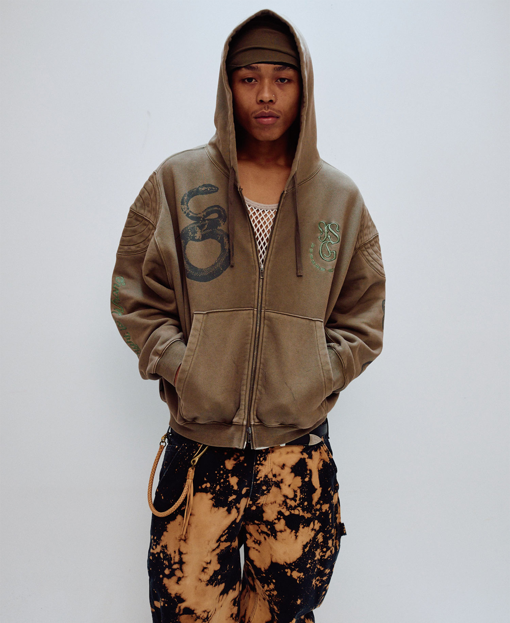 [CONTENT] Cotton 100% * COLOR MAY DIFFER DEPENDS ON THE LIGHT AND SCREEN CONDITION [DETAIL] • RYOHWA DYEING FOR A VINTAGE COLOR TONE • INSANE GARAGE ORIGINAL SEASON GRAPHIC ON THE FRONT • ORIGINAL SEASON GRAPHIC ON THE BACK WITH MIXED EMBROIDERY AND PRINT • SLIGHTLY CROPPED LENGTH • YKK TWO-WAY OPEN ZIPPER • INSANE GARAGE SIGNATURE SHOULDER PAD DETAIL • ORIGINAL VINTAGE KANGAROO POCKET DESIGN ON THE FRONT [CARE] -케어라벨 참고