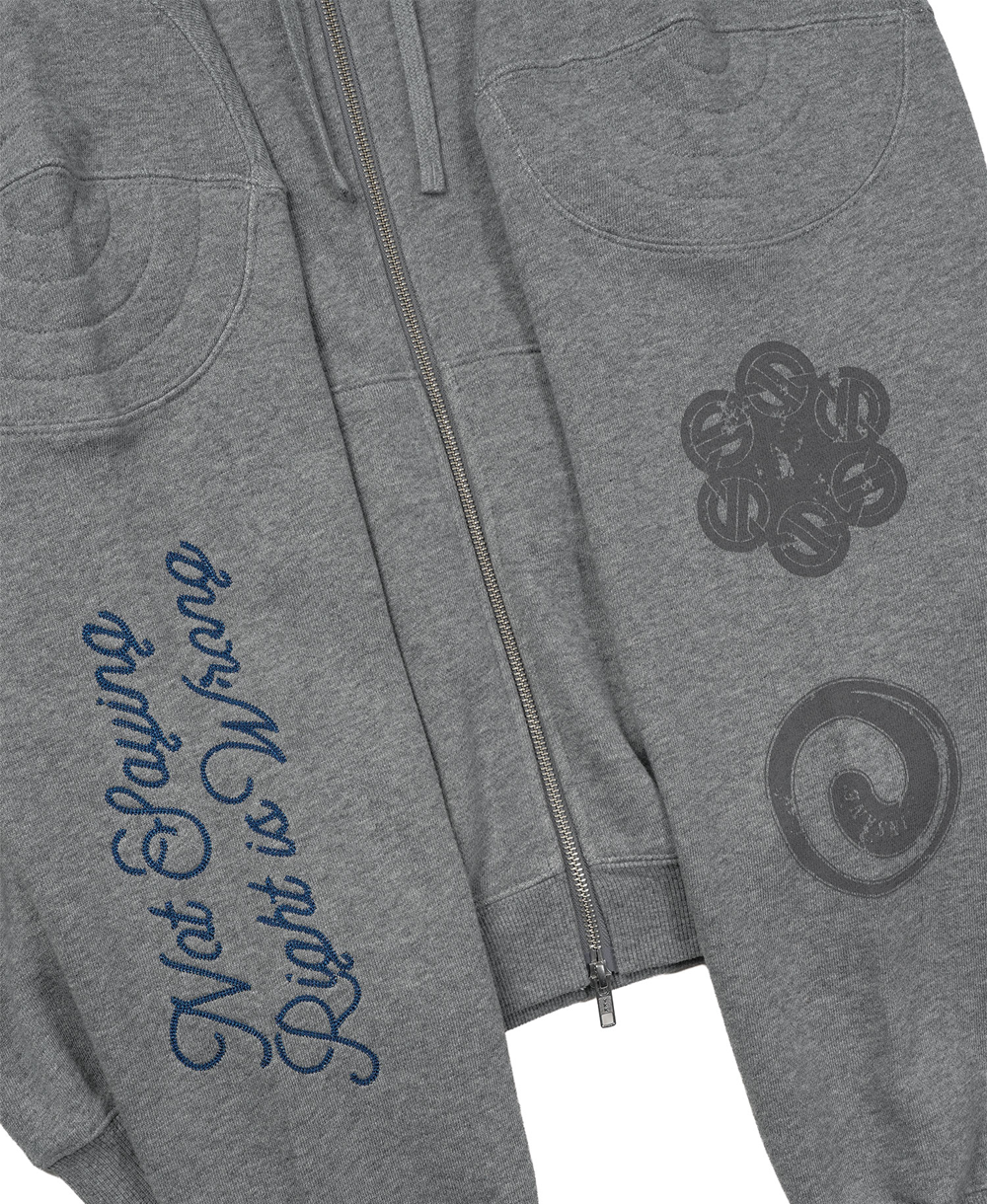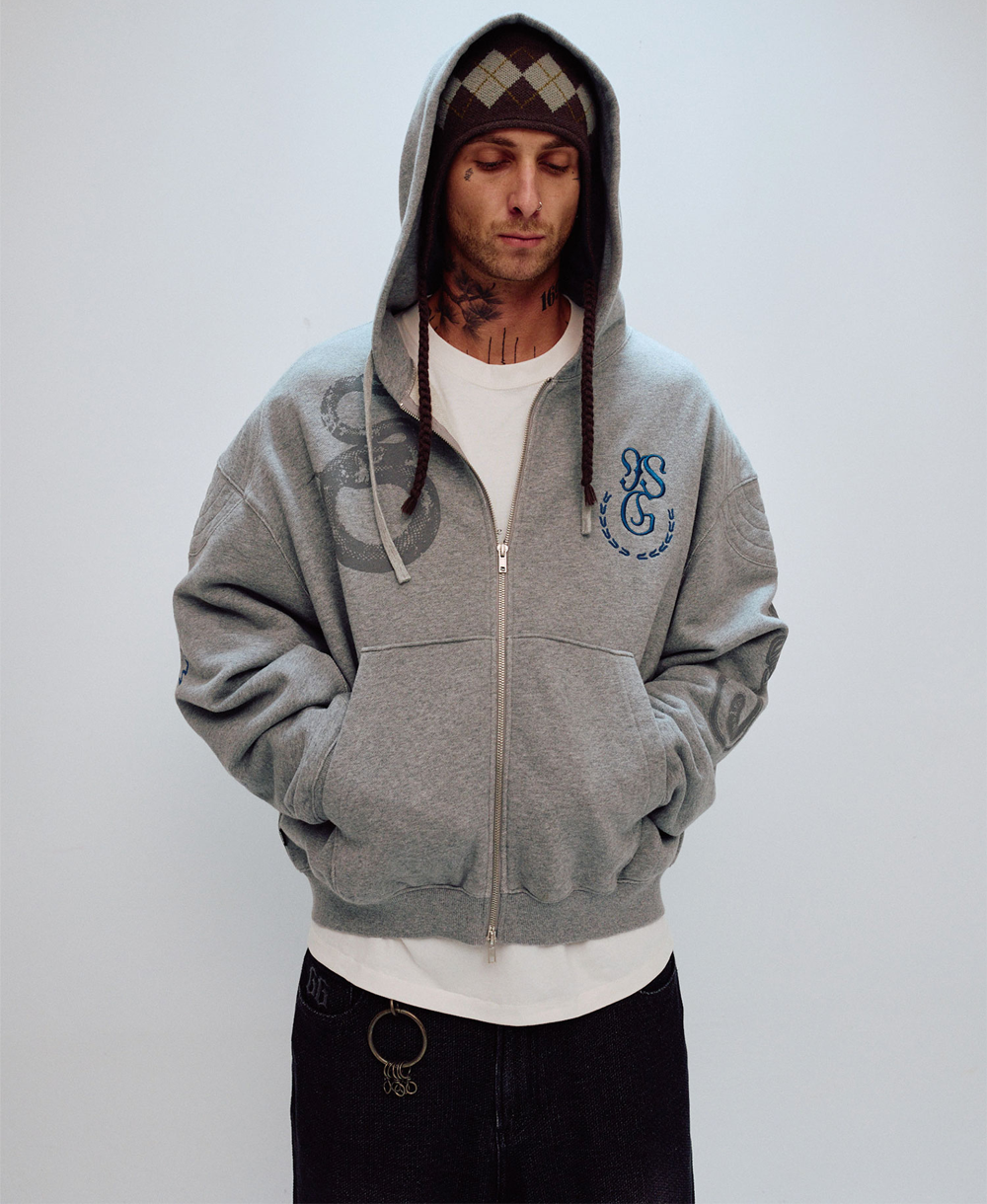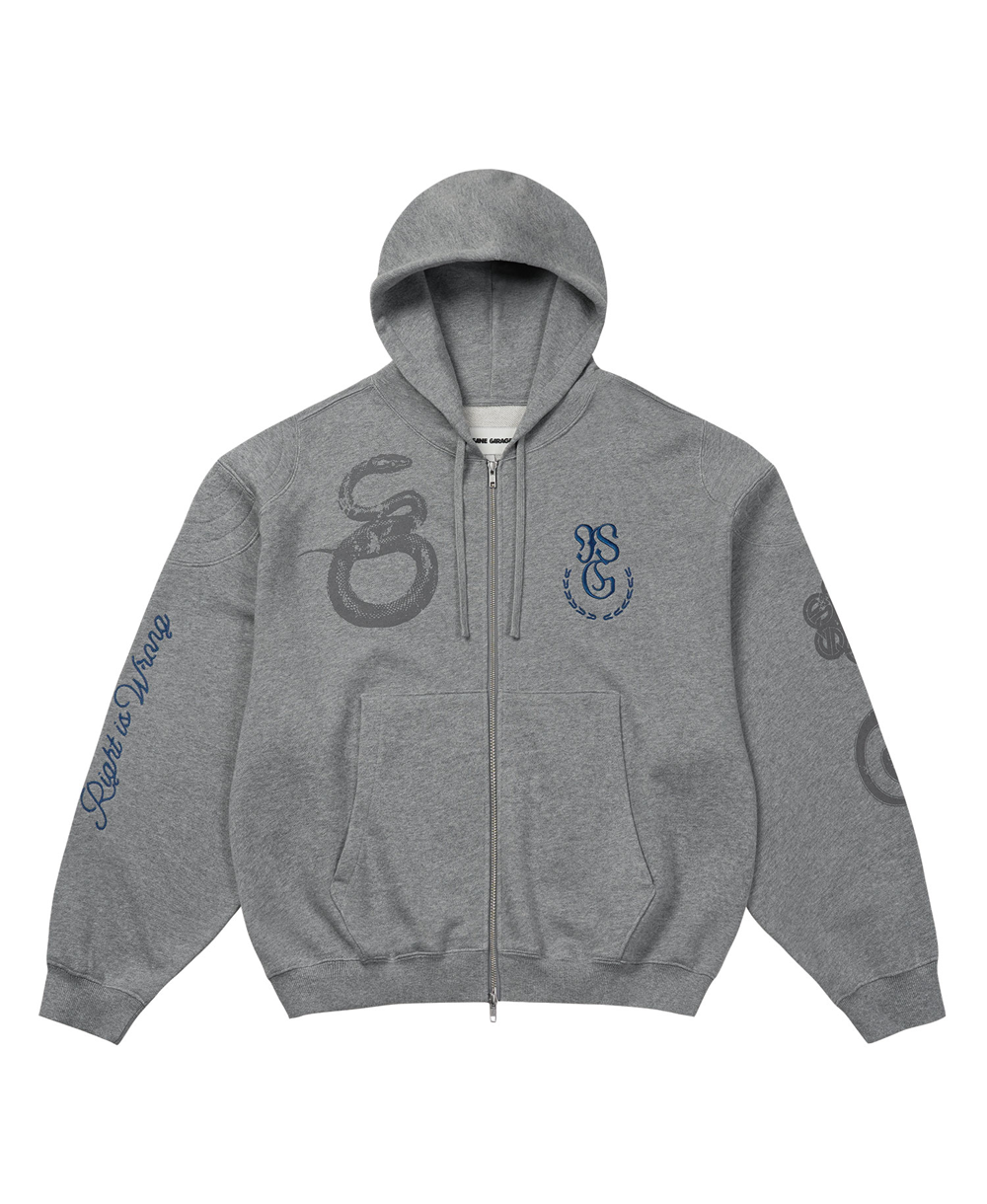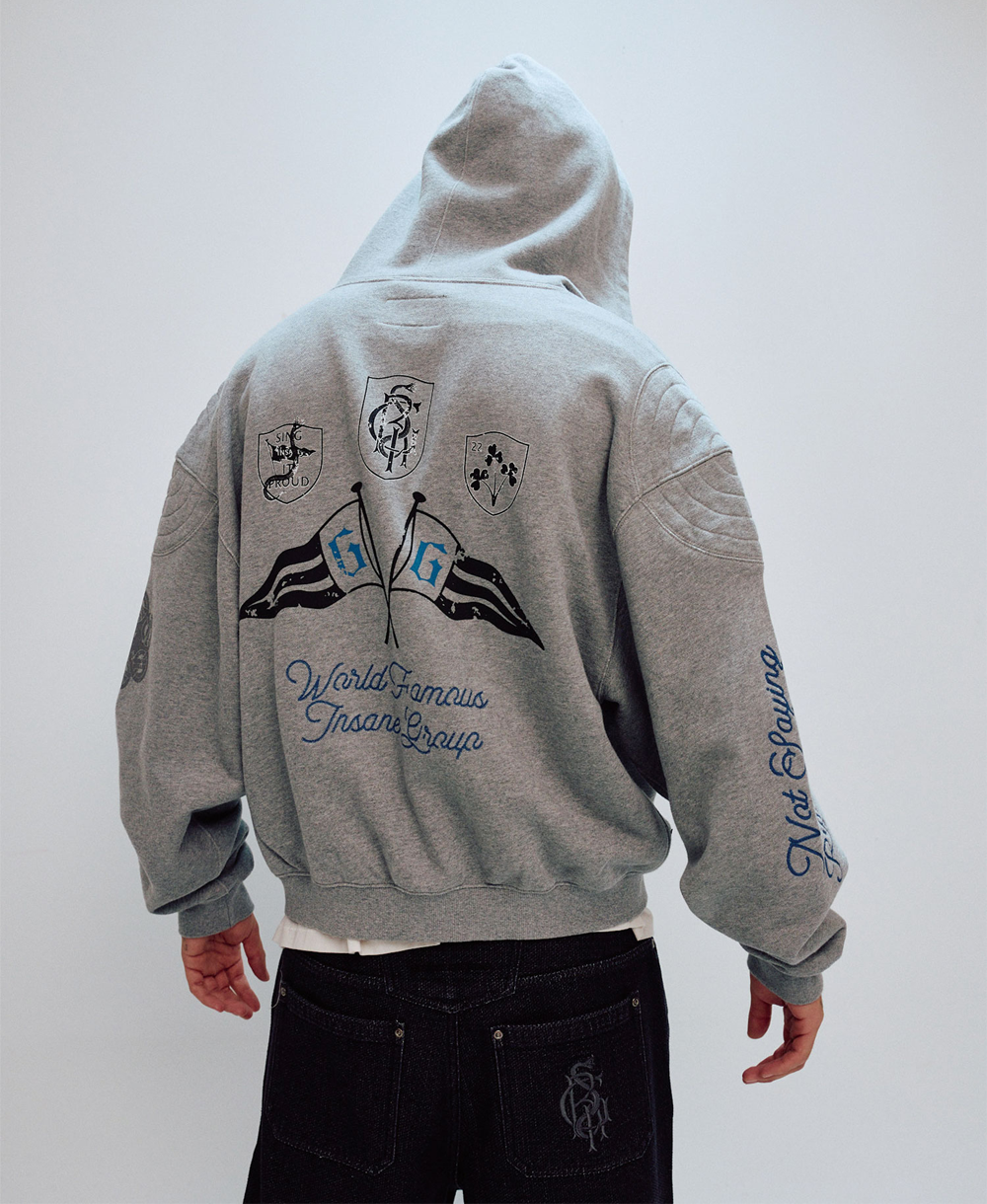 [CONTENT] Cotton 100% * COLOR MAY DIFFER DEPENDS ON THE LIGHT AND SCREEN CONDITION [DETAIL] • USING YARN-DYED FABRIC (DYED IN YARN STATE BEFORE KNITTING) FOR A SOFTER TOUCH THAN PIGMENT FABRIC (470G COTTON) • INSANE GARAGE ORIGINAL SEASON GRAPHIC ON THE FRONT • ORIGINAL SEASON GRAPHIC ON THE BACK WITH MIXED EMBROIDERY AND PRINT • SLIGHTLY CROPPED LENGTH • YKK TWO-WAY OPEN ZIPPER • INSANE GARAGE SIGNATURE SHOULDER PAD DETAIL • ORIGINAL VINTAGE KANGAROO POCKET DESIGN ON THE FRONT [CARE] -케어라벨 참고