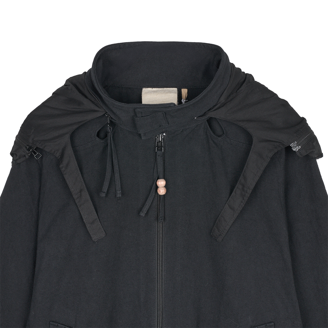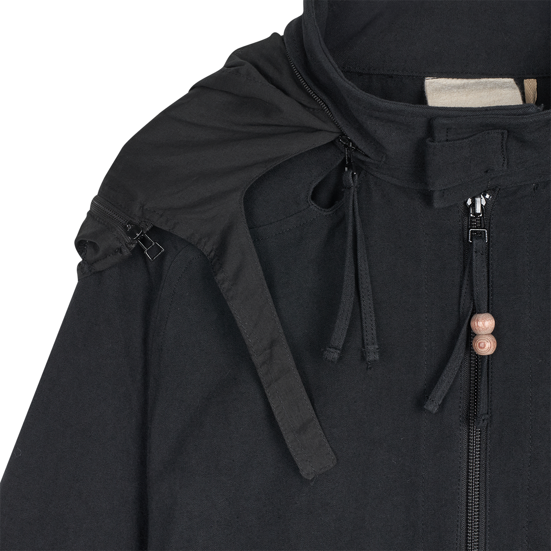 지안 예 베이직 유닛 01 블랙입니다. - 두껍고 튼튼한 코튼 리넨 소재 - 고급스러운 토글 지퍼 디자인 - 부분 탈부착 가능한 베일 후드