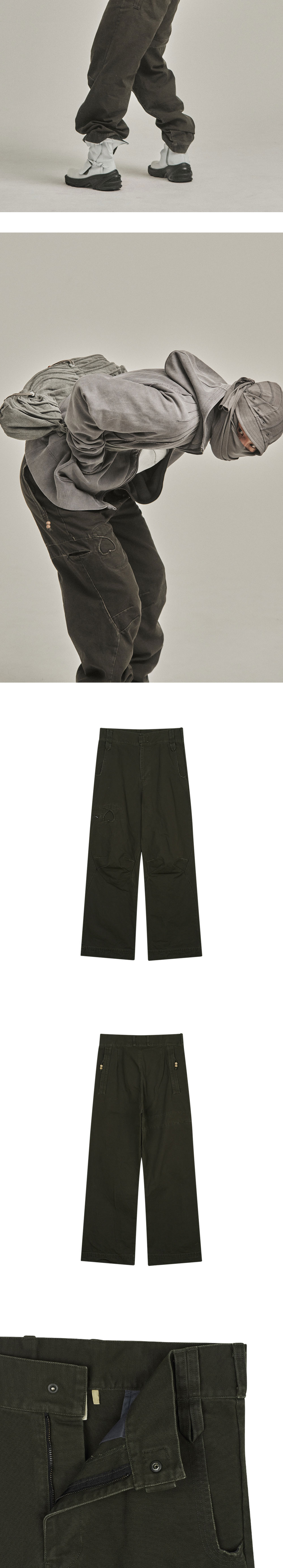지안 예 타오 팬츠 다크 올리브입니다. - 독특한 패널링 디자인 - 오른쪽 허벅지 지퍼 포켓 - 워크, 밀리터리 무드