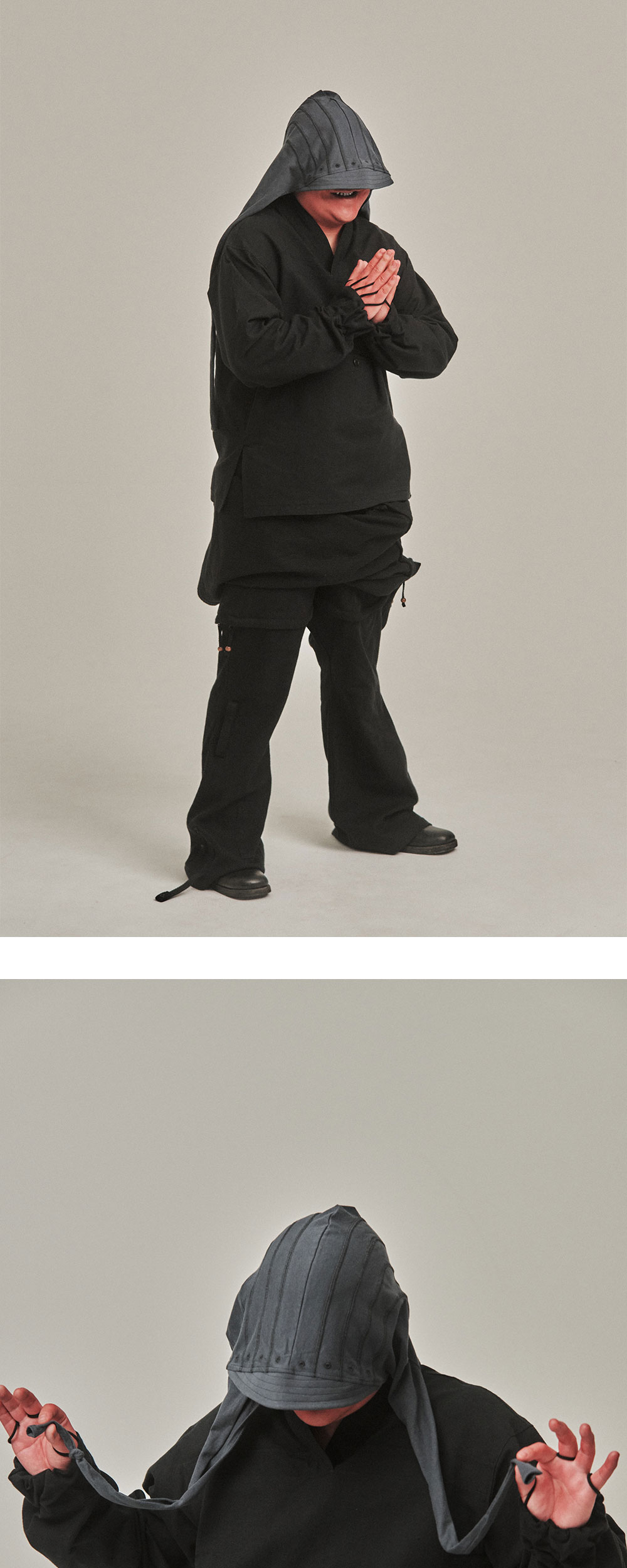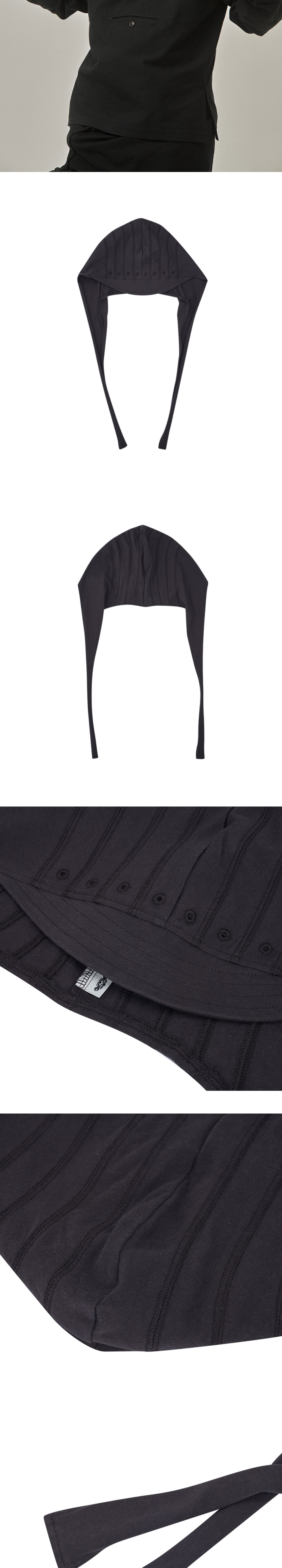 지안 예 즈킨 차콜입니다. - 두건 실루엣의 캡 디자인 - 아일렛과 스티치 포인트 - 얇은 챙 디테일 - 하단 스트랩으로 안정감 있게 묶어 착용 가능