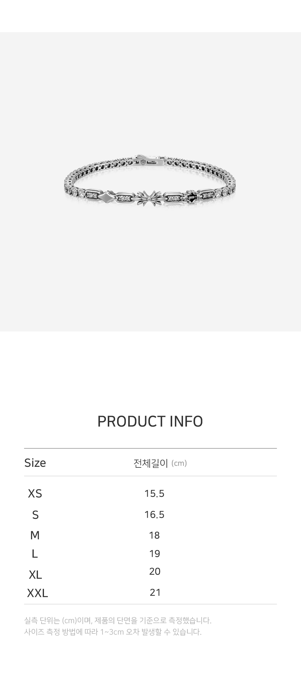 [Signature line 25] Scudo Signature Tennis Bracelet Material -Silver925 Texture - vintage glossy Stone -White * 테니스 브레슬릿의 옵션기준은 팔찌의 '전체 길이' 입니다. * 착용하실 손목둘레(cm)를 측정해 주시고 , 손목둘레 기준 +1~1.5cm 늘린 길이로 옵션을 선택해 주시면, 정핏으로 제작됩니다. 예) 손목둘레 15.5cm -> 옵션 16.5cm 선택 스쿠도의 주얼리는 맞춤 handcraft 주얼리로, 7~10일 제작기간이 소요됩니다. (주말 / 공휴일 제외) 추가 제품 상담이 필요하시면, 문의 부탁드립니다.