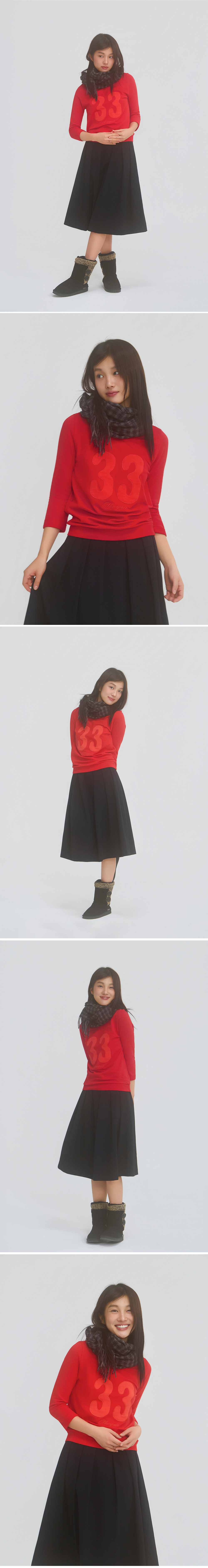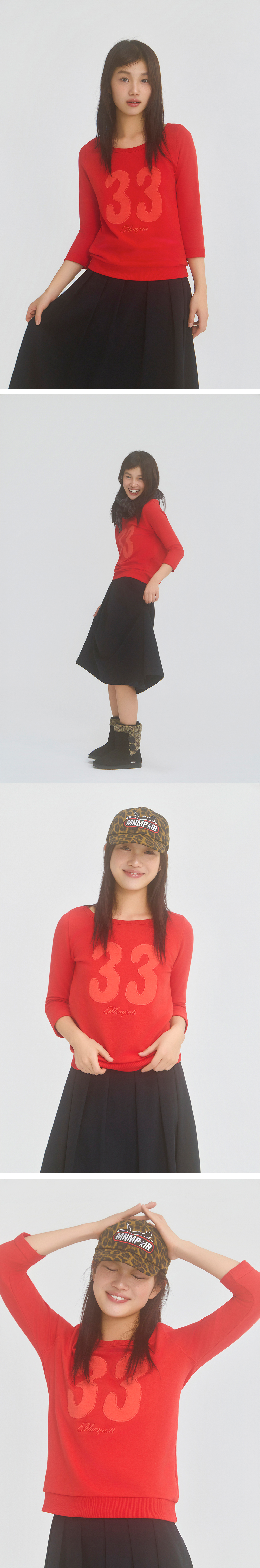 - 유연하고 안정감 있는 원단으로 편안한 신축성과 부드러운 착용감 제공합니다. - 전면의 숫자 33은 MNMPAIR의 ‘MM’을 회전시켜 만든 심볼릭한 그래픽입니다. - 톤온톤 아플리케와 러프한 스티치로 빈티지 무드를 더했습니다. - 하단 MNMPAIR 엠보 자수로 브랜드 포인트를 주었습니다. - 넓은 U넥 디자인으로 오프숄더 연출이 가능합니다. - 7~8부 소매 기장이 여리여리한 실루엣을 강조합니다.