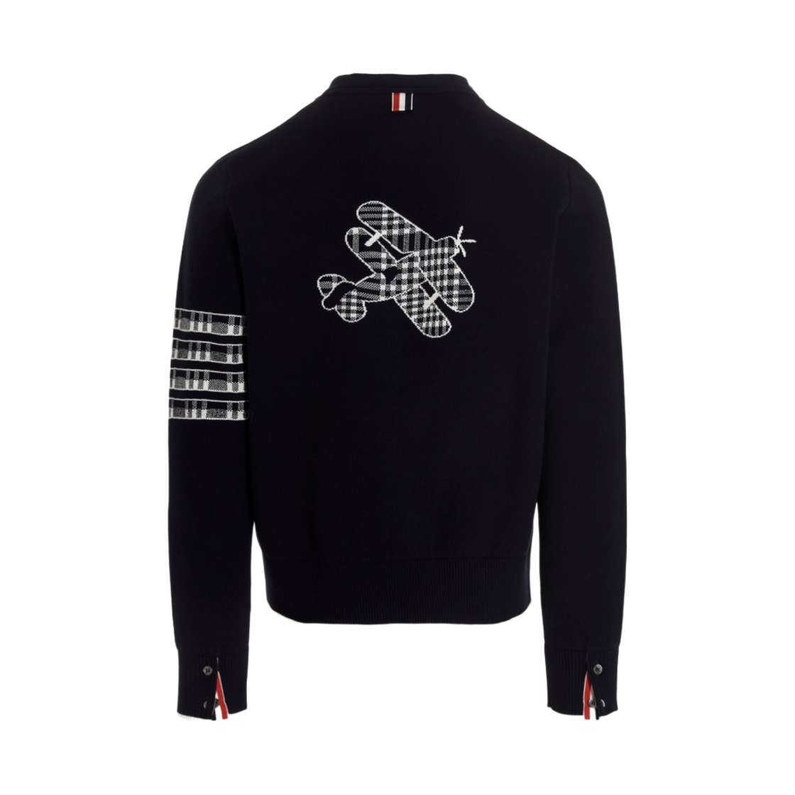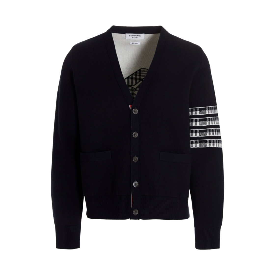 Thom Browne Cotton Plane Jacquard Back 4-Bar V-Neck Cardigan Navy