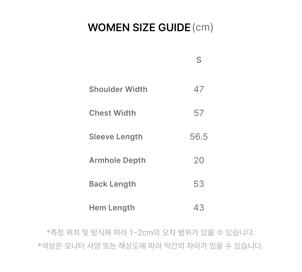 | 어깨 | 가슴단면 | 소매장 | 암홀 | 총기장 | 밑단 |