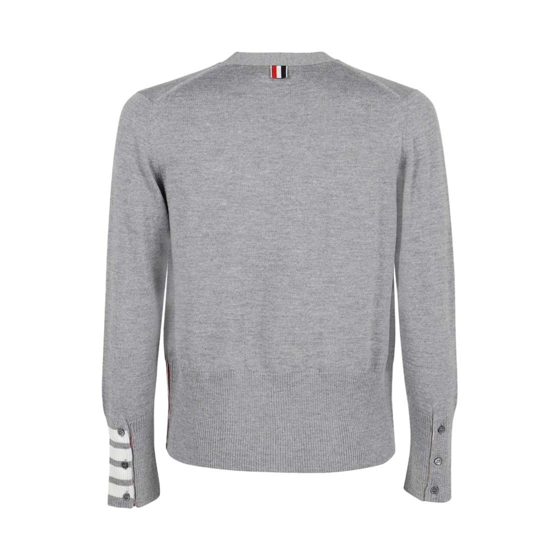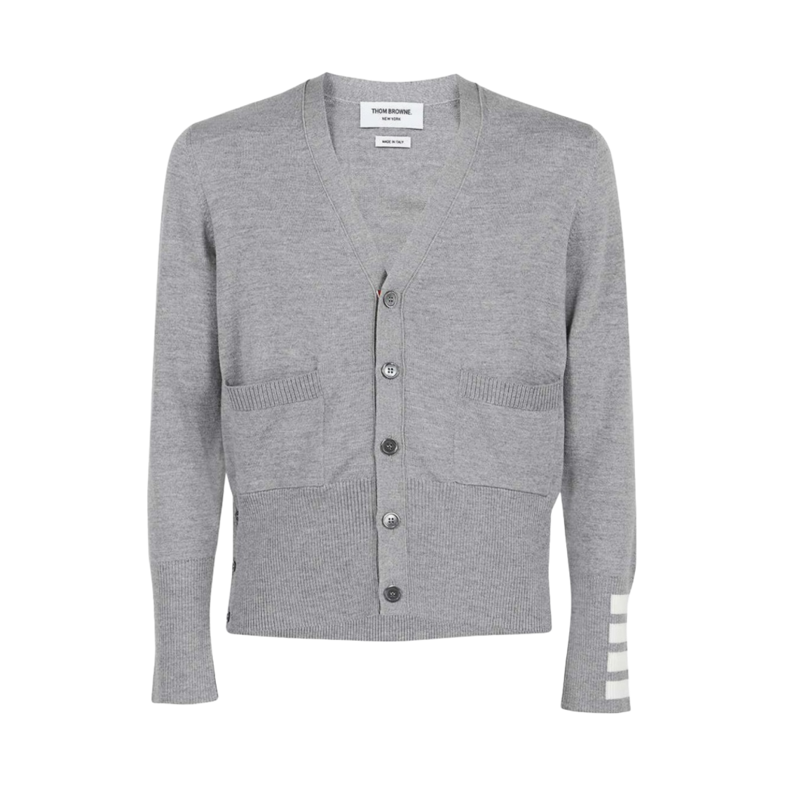 Thom Browne Fine Merino Wool 4-Bar Cuff V-Neck Cardigan Light Grey