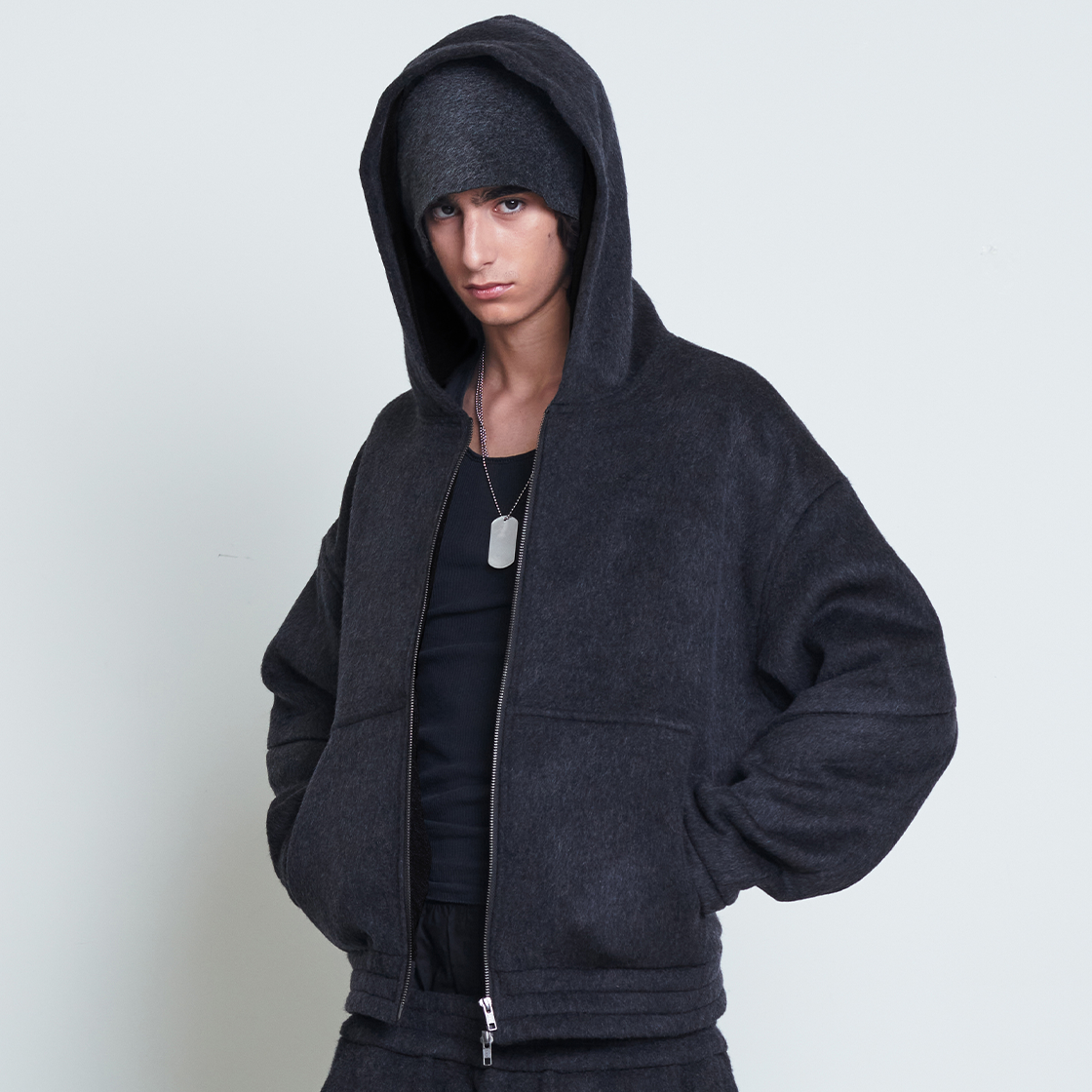 고밀도 울 혼방으로 완성한 후드 집업 상의입니다. 포근한 터치와 우수한 보온성이 장점이며, 겉면은 은은한 헤어 텍스처로 고급스러운 깊이를 보여줍니다. 드롭 숄더의 여유로운 실루엣이 체형을 자연스럽게 커버하고, 밑단의 이중 리브 디테일이 형태를 단단히 잡아줍니다. 투웨이 지퍼로 착·탈과 통풍이 편리하며, 큼직한 포켓으로 실용성까지 확보. 간절기부터 한겨울까지 따뜻하게 입기 좋은, 존재감 있는 데일리 아우터입니다