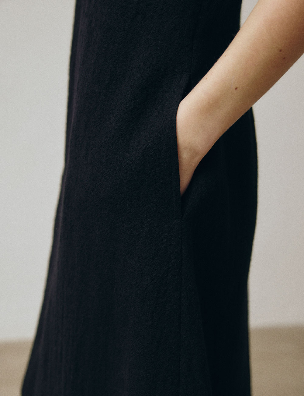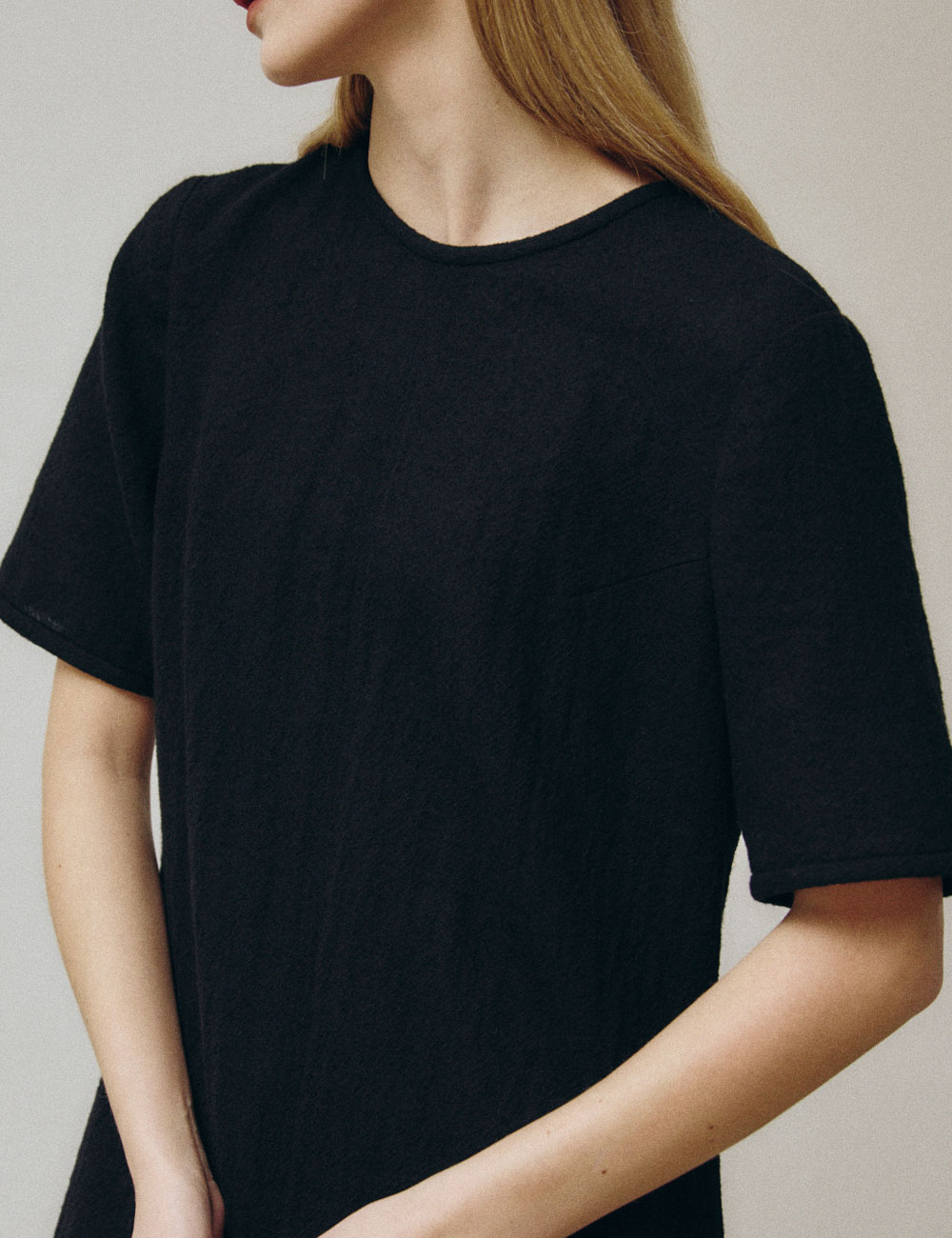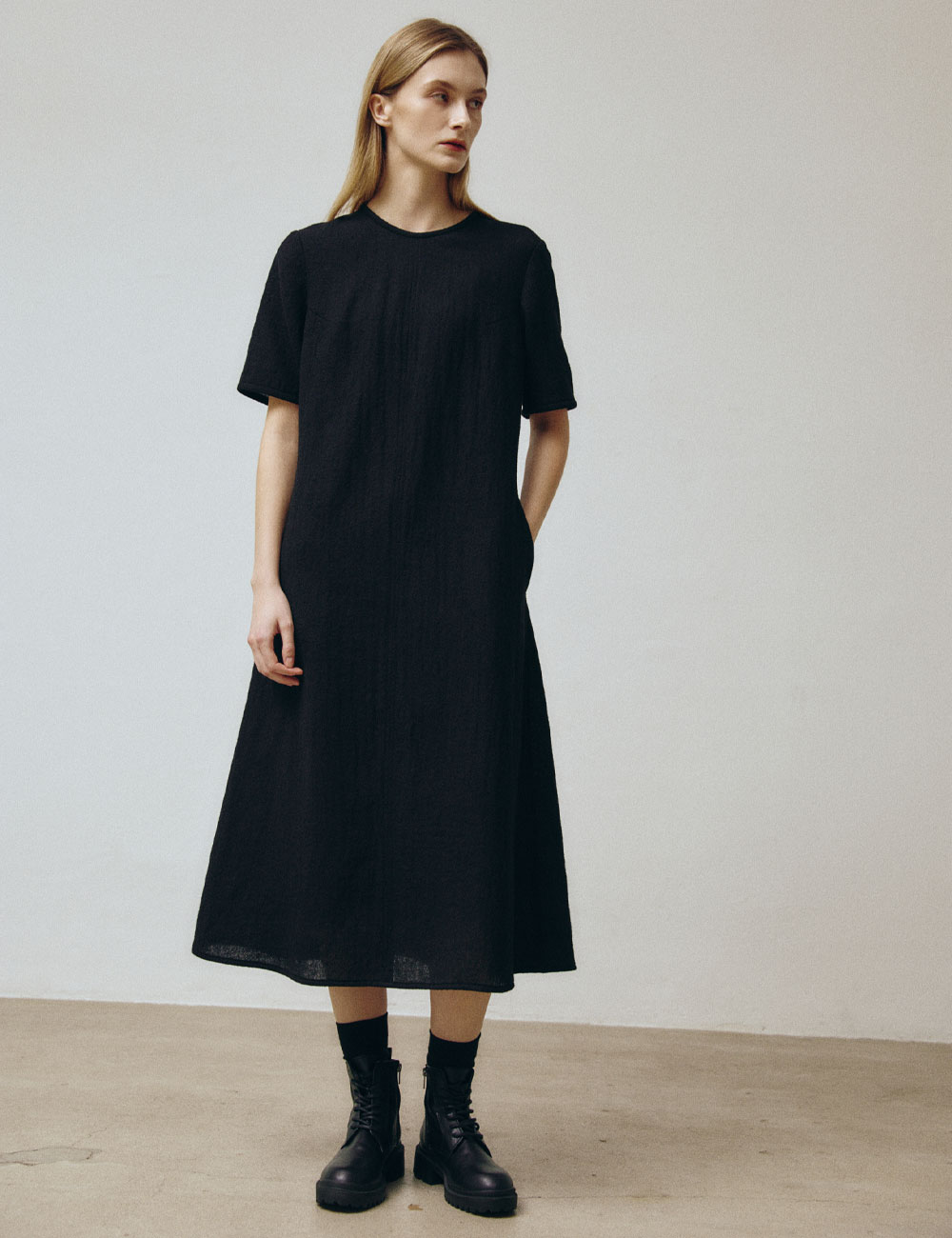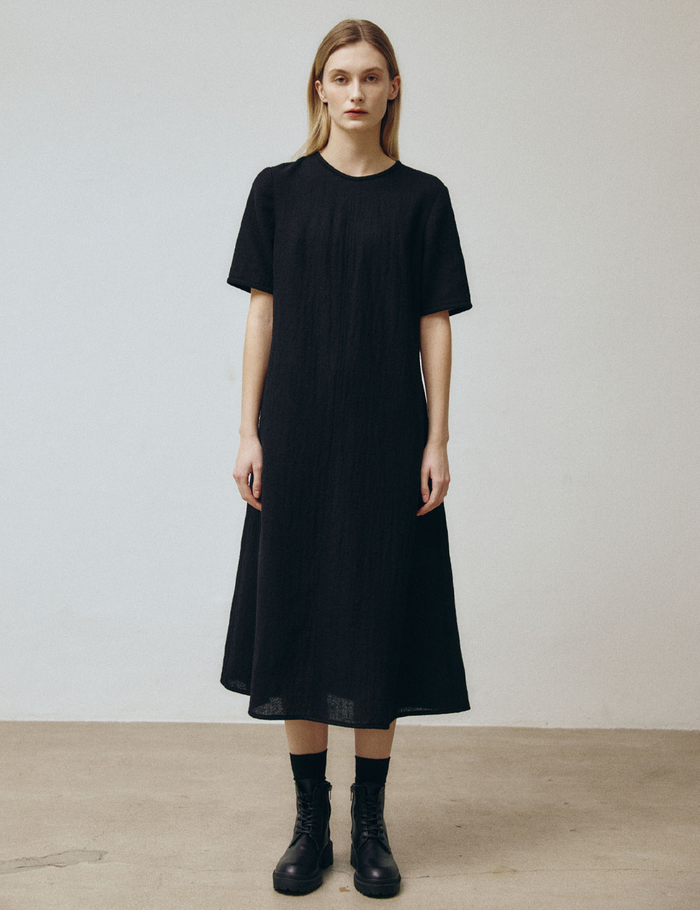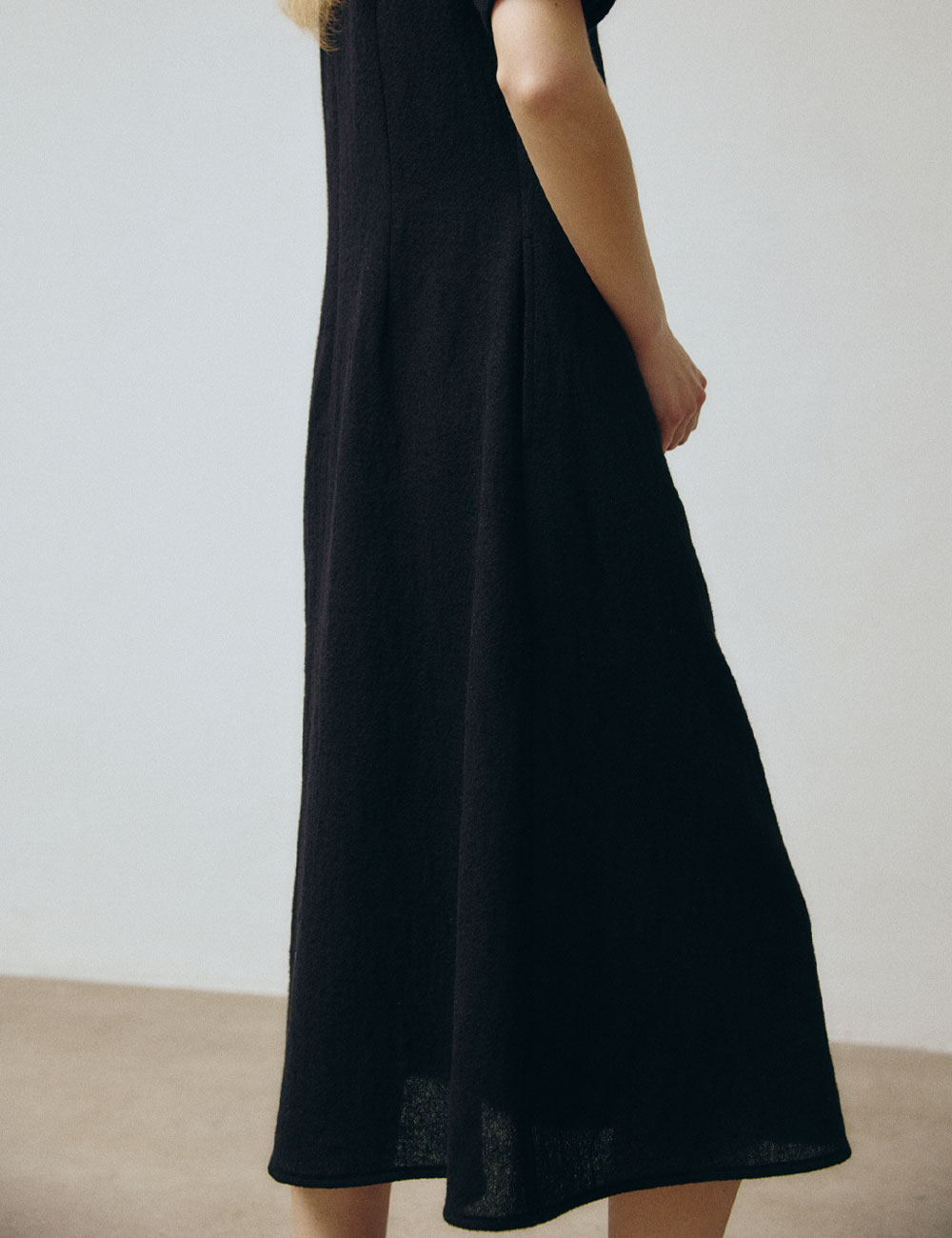 - 미니멀한 하프슬리브의 미디 드레스 - 스티치가 보이지 않는 깔끔한 크루넥 라인 마감 - 허리 라인이 강조되는 실루엣 - 울 거즈 원단 사용으로 가벼운 착용감 - 뒷면에 겉으로 드러나지 않는 지퍼 여밈