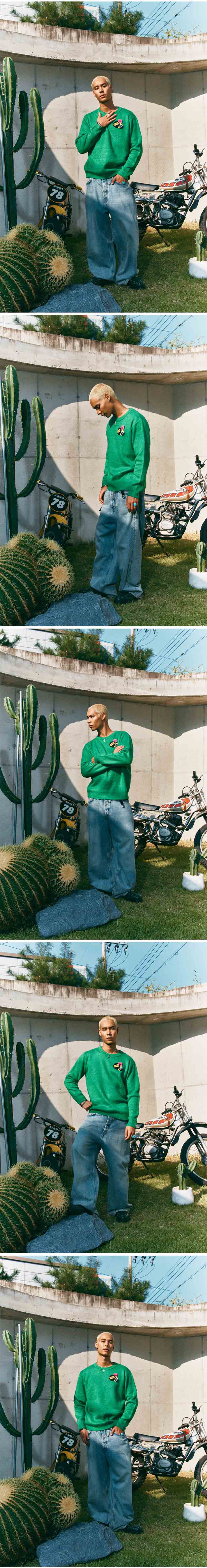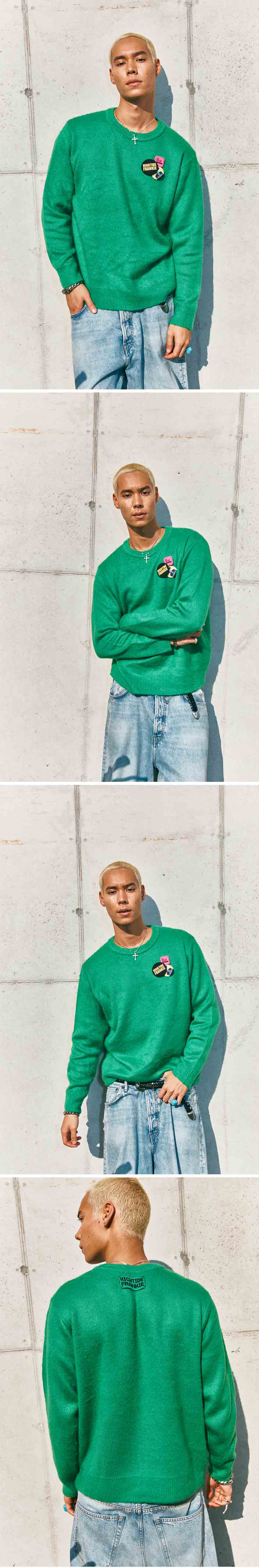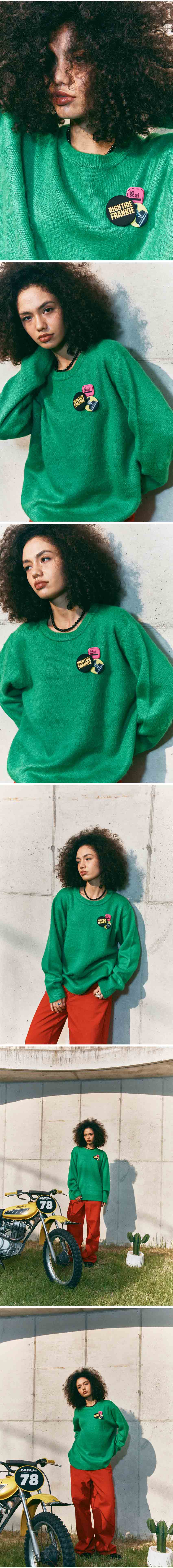 SIZE : FREE 어깨 48cm 가슴 62cm 소매 63cm 기장 68cm 사이즈 측정은 재는 방법과 위치에 따라 1~3cm 오차가 발생할수 있음 Akira : 182cm 69kg Koky : 167cm 53.5kg 여유있는 루즈핏의 라운드넥 니트로 7게이지 2합의 아크릴사 100% 로 제작 되었습니다 겉면에 브러쉬 작업을 더해 포근한 터치감과 함께 뒷면에 핸드 스티치로 고정한 니트 패치 디테일 로 포인트를 했습니다 3종류의 프랭키 뱃지가 포함된 상품 입니다 이염 주의 -주의- 드라이클리닝 Made in Korea