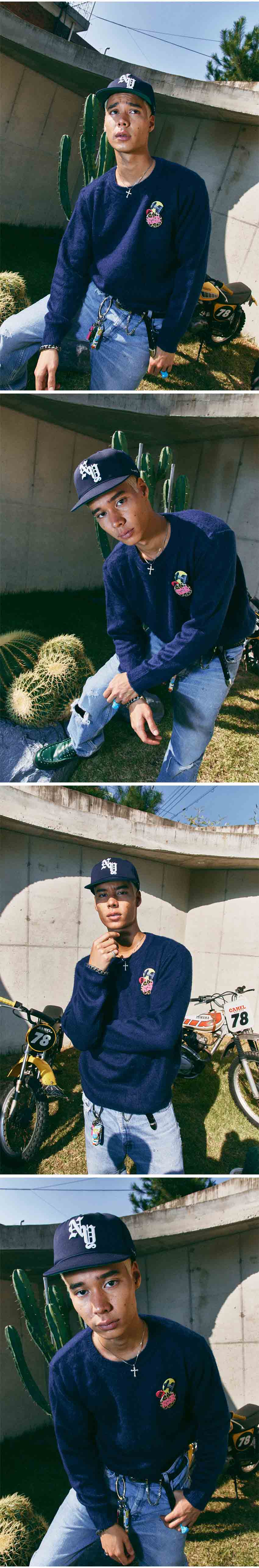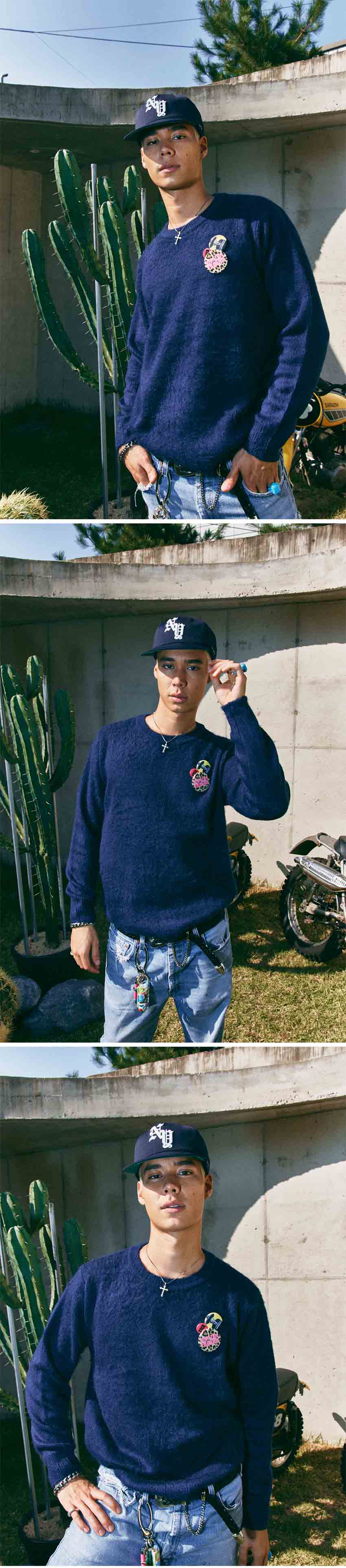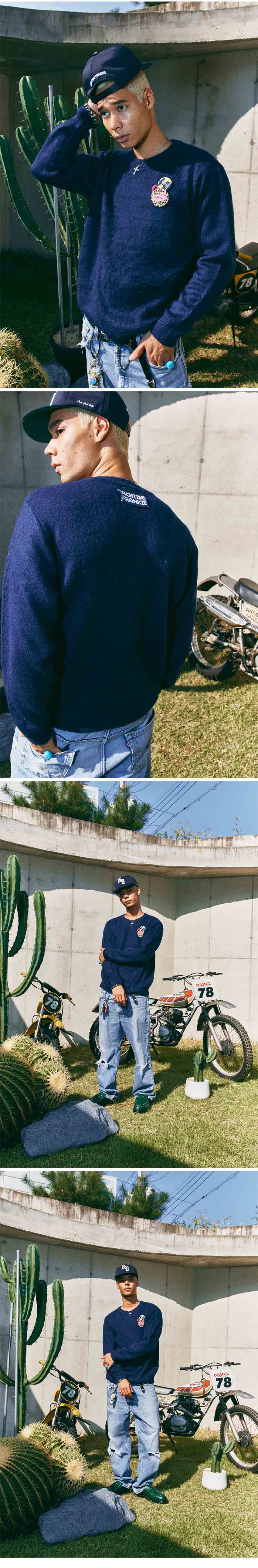 SIZE : FREE 어깨 48cm 가슴 62cm 소매 63cm 기장 68cm 사이즈 측정은 재는 방법과 위치에 따라 1~3cm 오차가 발생할수 있음 Akira : 182cm 69kg Koky : 167cm 53.5kg 여유있는 루즈핏의 라운드넥 니트로 7게이지 2합의 아크릴사 100% 로 제작 되었습니다 겉면에 브러쉬 작업을 더해 포근한 터치감과 함께 뒷면에 핸드 스티치로 고정한 니트 패치 디테일 로 포인트를 했습니다 3종류의 프랭키 뱃지가 포함된 상품 입니다 이염 주의 -주의- 드라이클리닝 Made in Korea