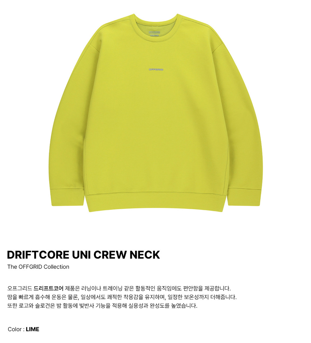 오프그리드 드리프트코어 유니 크루 넥 라임