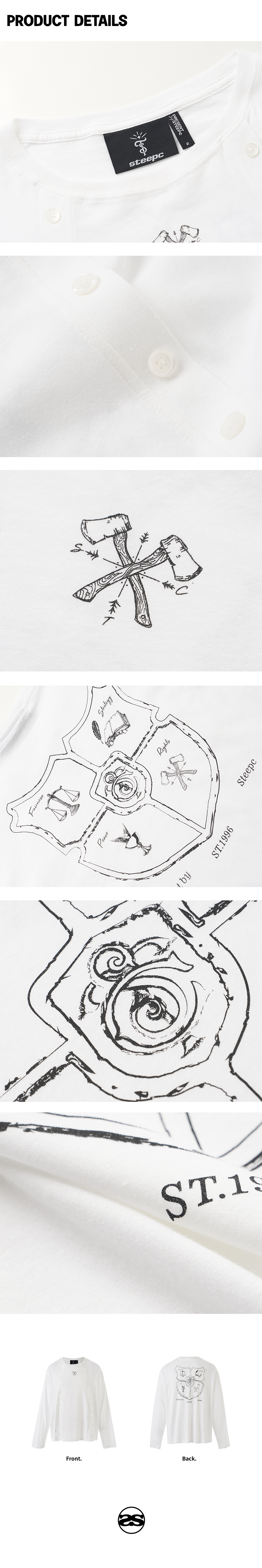 크롭 기장 롱슬리브로 체형 비율을 자연스럽게 보완 면과 한마 혼방 소재로 자연스러운 드레이프감과 우수한 내구성 이중 버튼 디테일과 빈티지 감성의 핸드 드로잉 엠블럼 프린트 특징 해체적인 버튼 구조와 레이어드된 밑단 디자인으로 여유로운 실루엣 연출