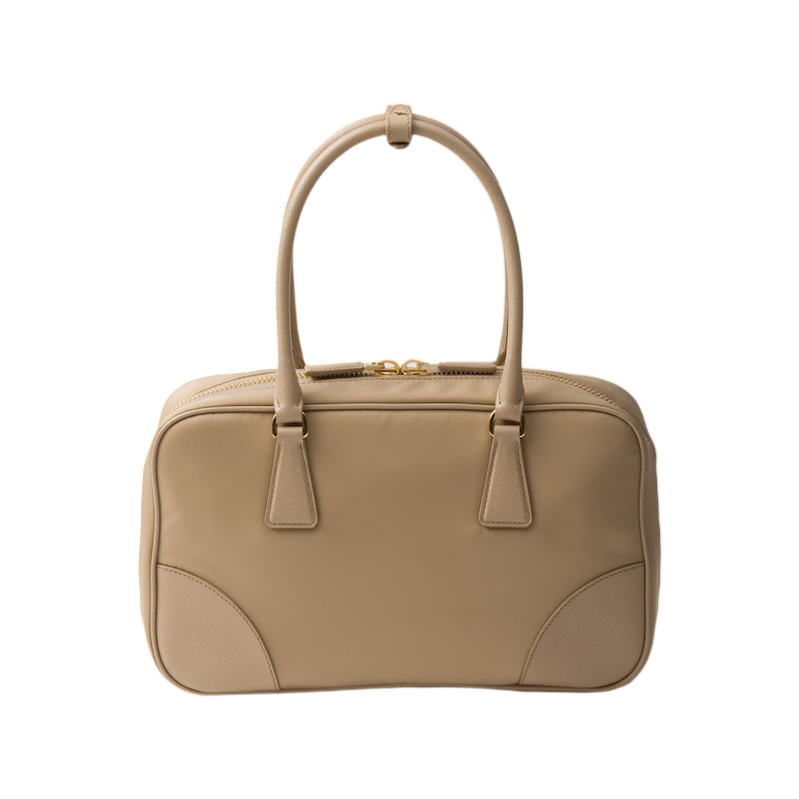 프라다 레 에디션 1978 미디움 리나일론 앤 사피아노 레더 투 핸들 백 카멜 브라운