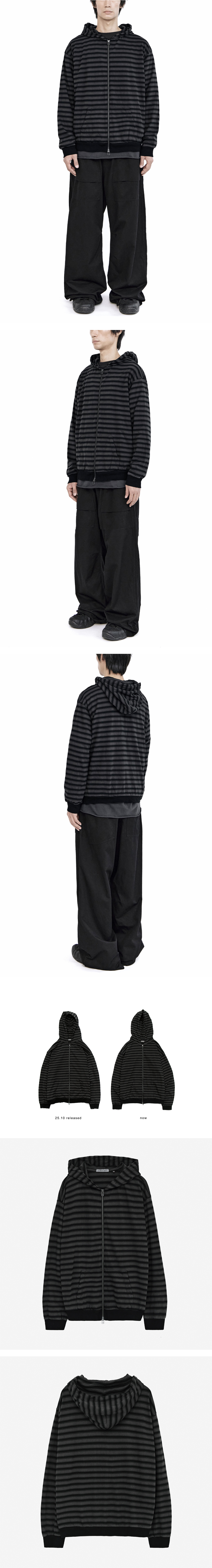human striped zip hoodie - black *얇고 부드러운 스트라이프 원단 *넉넉한 깊이감의 후드 *밀리터리 타입 투웨이 지퍼 *적당한 텐션의 소매 & 밑단 립 *모델: 170 중반, 마른 체형 / 3사이즈 착용