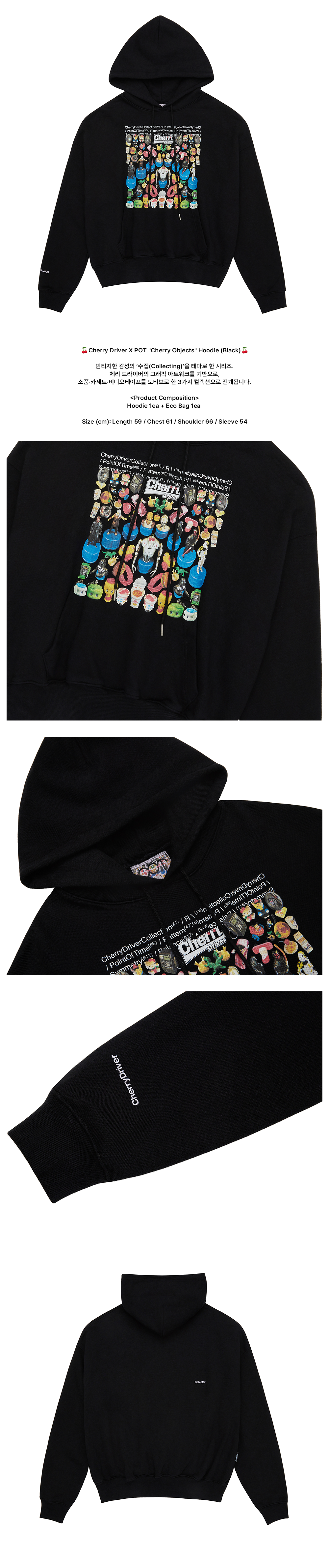🍒Cherry Driver X POT "Cherry Objects" Hoodie (Black)🍒 빈티지한 감성의 ‘수집(Collecting)’을 테마로 한 시리즈. 체리 드라이버의 그래픽 아트워크를 기반으로, 소품·카세트·비디오테이프를 모티브로 한 3가지 컬렉션으로 전개됩니다. <Product Composition> Hoodie 1ea + Eco Bag 1ea Size (cm): Length 59 / Chest 61 / Shoulder 66 / Sleeve 54