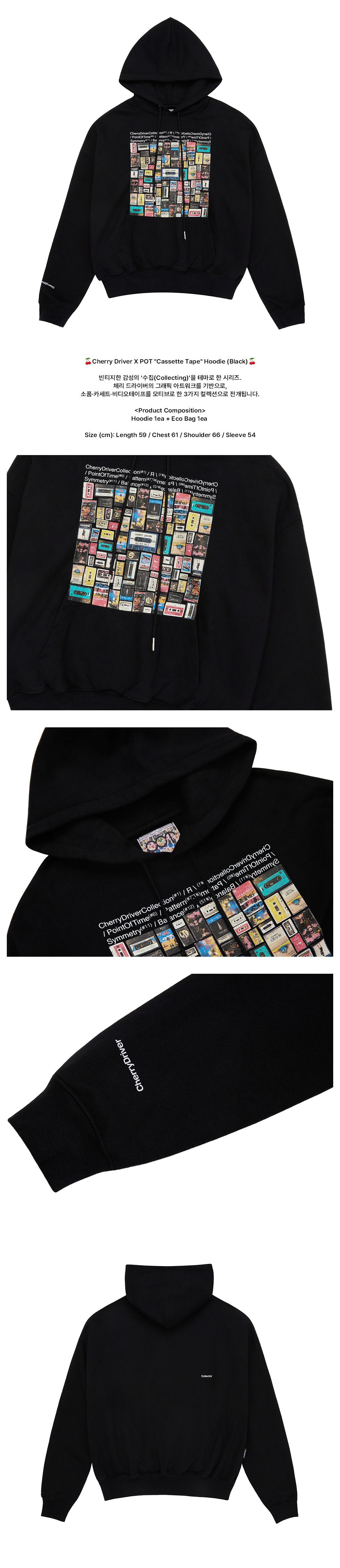 🍒Cherry Driver X POT "Cassette Tape" Hoodie (Black)🍒 빈티지한 감성의 ‘수집(Collecting)’을 테마로 한 시리즈. 체리 드라이버의 그래픽 아트워크를 기반으로, 소품·카세트·비디오테이프를 모티브로 한 3가지 컬렉션으로 전개됩니다. <Product Composition> Hoodie 1ea + Eco Bag 1ea Size (cm): Length 59 / Chest 61 / Shoulder 66 / Sleeve 54