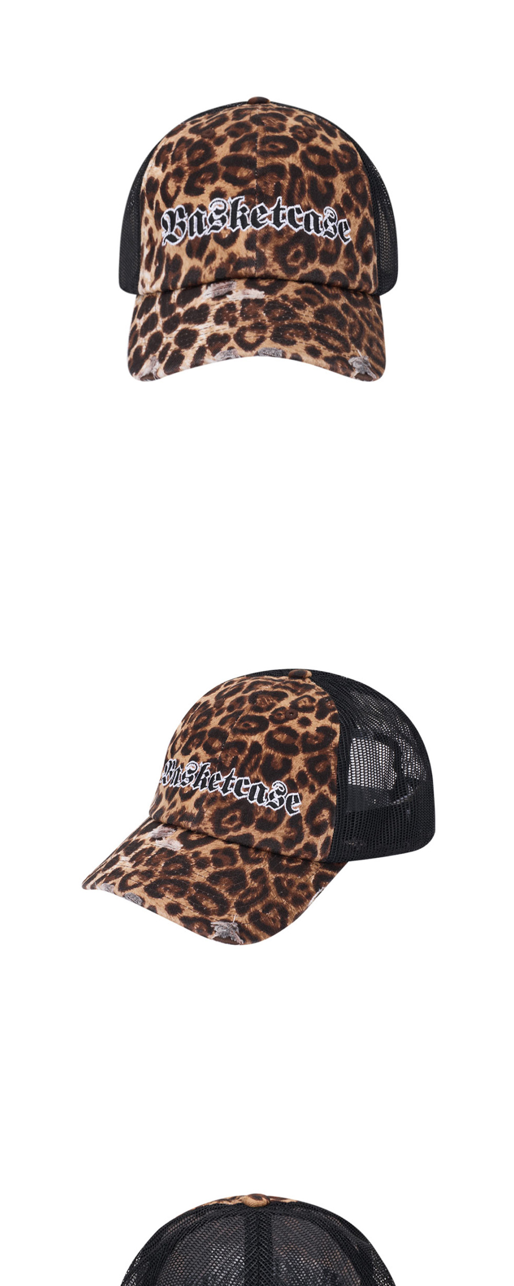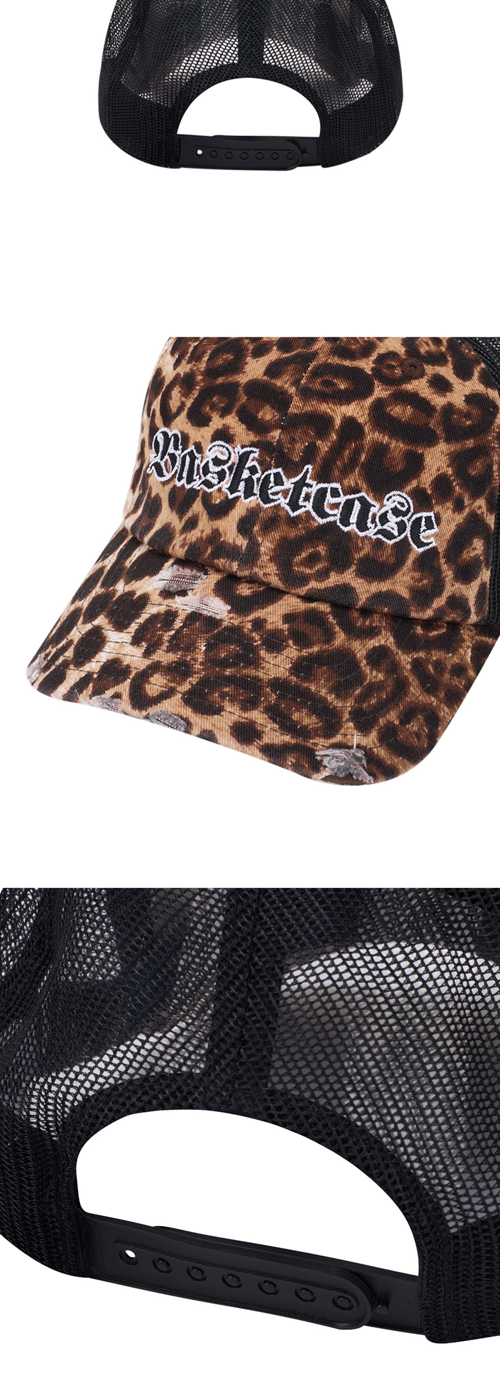 바스켓케이스 빅토리아 트러커 치타입니다. - 치타 패턴과 로고 자수가 돋보이는 트러커 캡 - 코튼 앞 패널과 메쉬 백 패널 구성 - 챙 부분 헤짐 디테일 - 후면 스냅백 스트랩