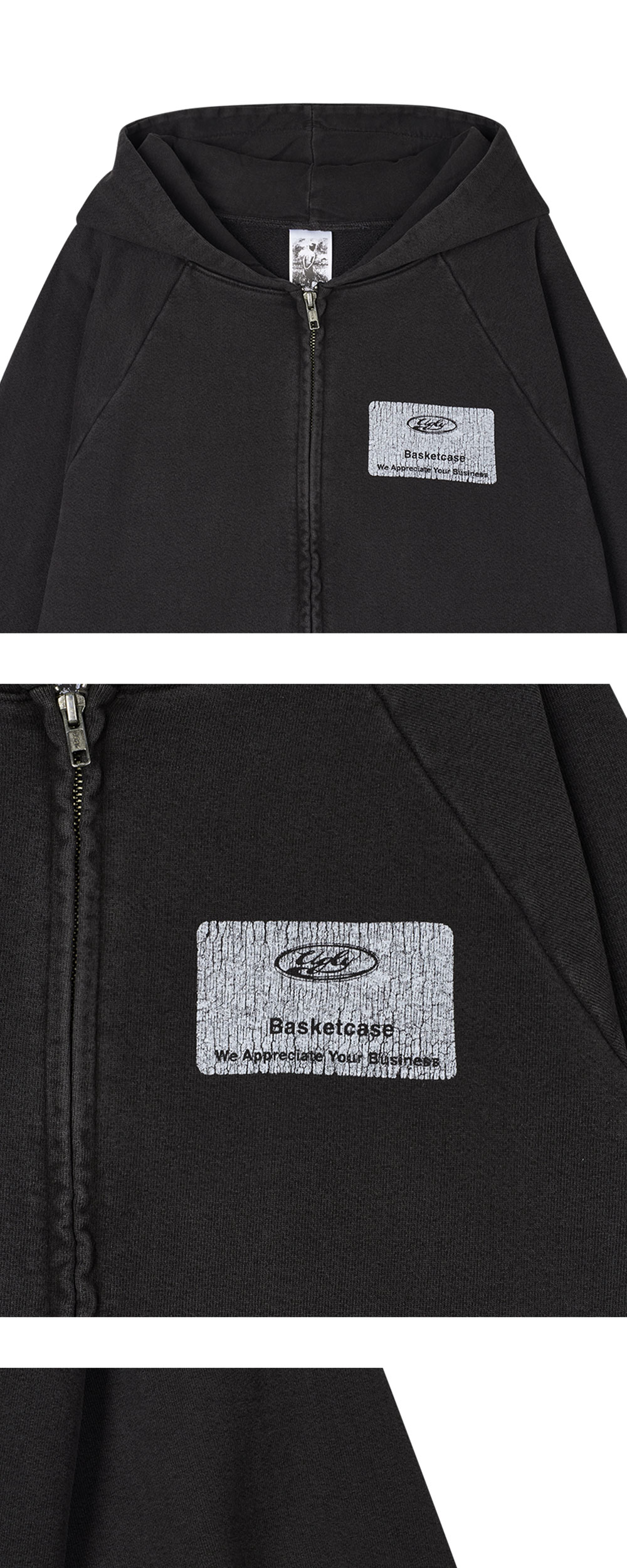바스켓케이스 어글리 집업 후디 빈티지 블랙입니다. - 전후면 빈티지한 무드의 그래픽이 돋보이는 후드 집업 - 페이드 블랙 워싱 컬러 - 캥거루 포켓 디테일 - 래글런 소매