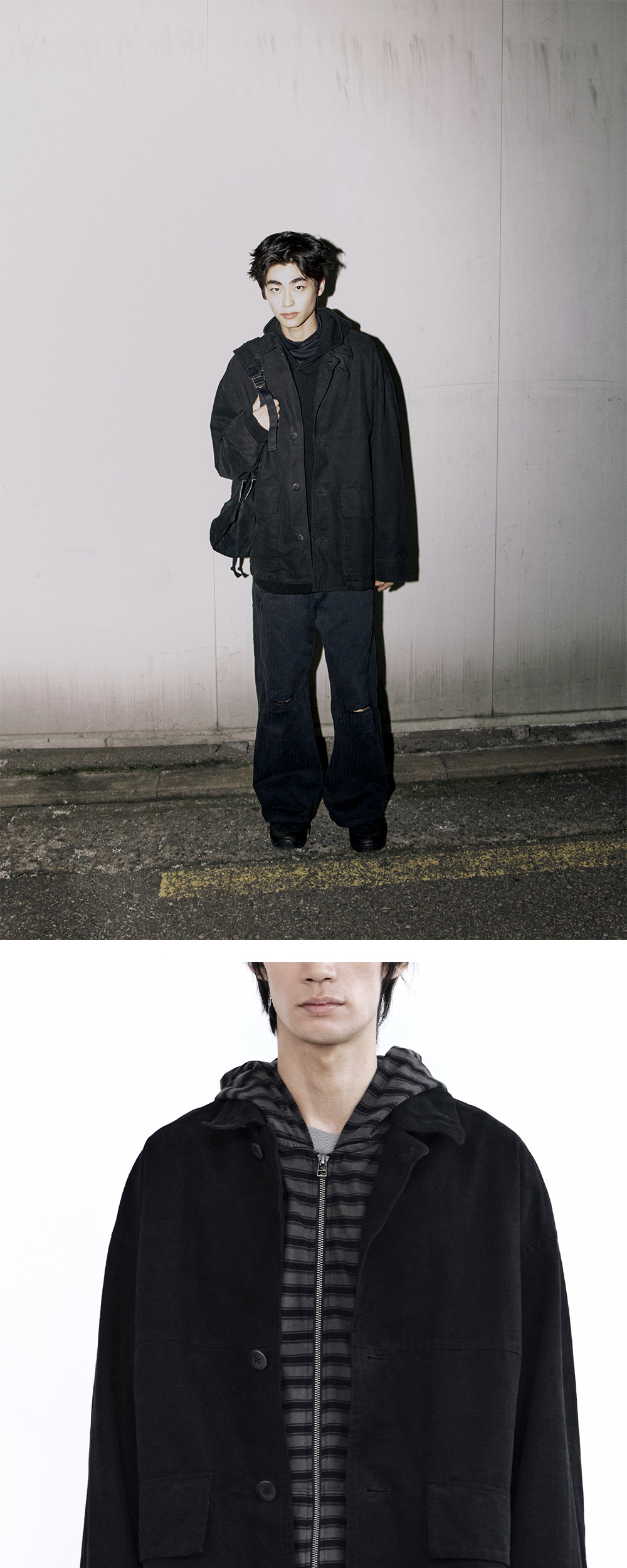 officer jacket - black 옅은 스트라이프 조직감과 광택이 특징적인 중기장 형식의 코튼 자켓. 클래식한 디자인으로 무심한 듯 편안하게 착용 가능하지만 고급스러운 원단과 부자재로 제작되어 은은한 존재감을 발합니다. 카라는 탈부착 가능한 비조 적용해주었으며 상단 버튼 체결 여부에 따라 2가지 형식으로 카라의 형태를 조절 가능합니다. 어깨 후면 다트 디테일, 포근한 착용감의 코튼 풀 라이닝. 전면 하단부 2개의 플랩 포켓 구성. 사이드 어드저스터와 소맷단의 버튼으로 취향껏 실루엣 조절이 가능합니다. *모델: 170 중반 / 마른 체형, 3사이즈 착용 *일반 체형 기준 - 170cm 초반 이하 2사이즈 권장 - 170cm 중반 3사이즈 권장 - 170cm 후반~180cm 초반 4사이즈 권장