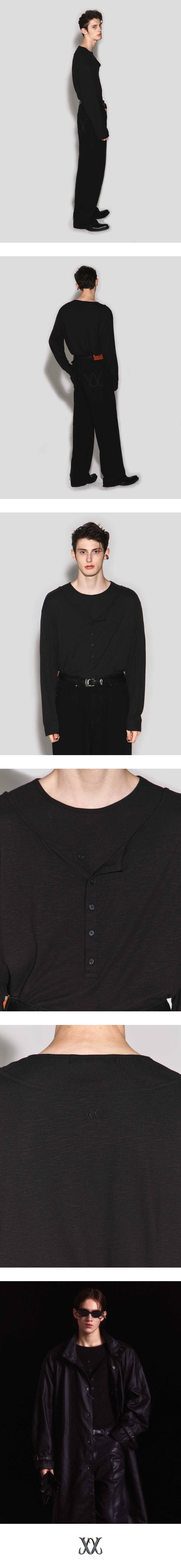 - 부드럽고 탄탄한 오버 핏 골지 긴팔 헨리넥 - 넓은 헨리 넥과 기본 넥 라인의 레이어드 디자인 - 독특한 문양이 새겨진 헨리넥 단추 사용 - 소매 앞 & 뒤 중앙 절개와 바인딩 디테일 - 등판 웨슬리 휴스턴 자수 로고 디테일 - DRY CLEAN or WASH SEPARATELY