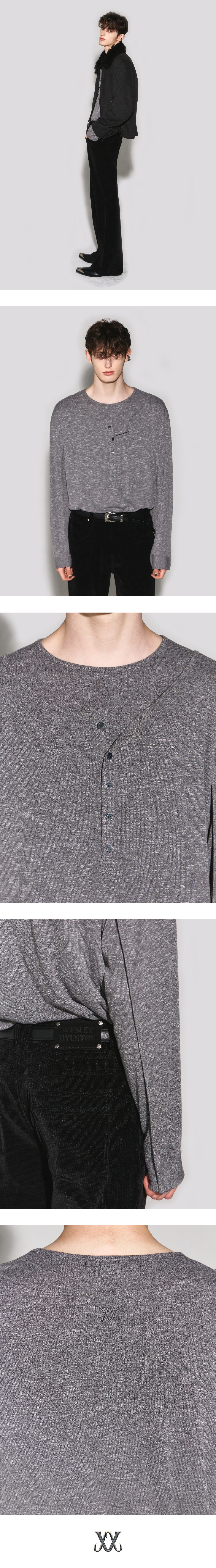 - 부드럽고 탄탄한 오버 핏 골지 긴팔 헨리넥 - 넓은 헨리 넥과 기본 넥 라인의 레이어드 디자인 - 독특한 그라데이션의 헨리넥 단추 사용 - 소매 앞 & 뒤 중앙 절개와 바인딩 디테일 - 등판 웨슬리 휴스턴 자수 로고 디테일 - DRY CLEAN or WASH SEPARATELY