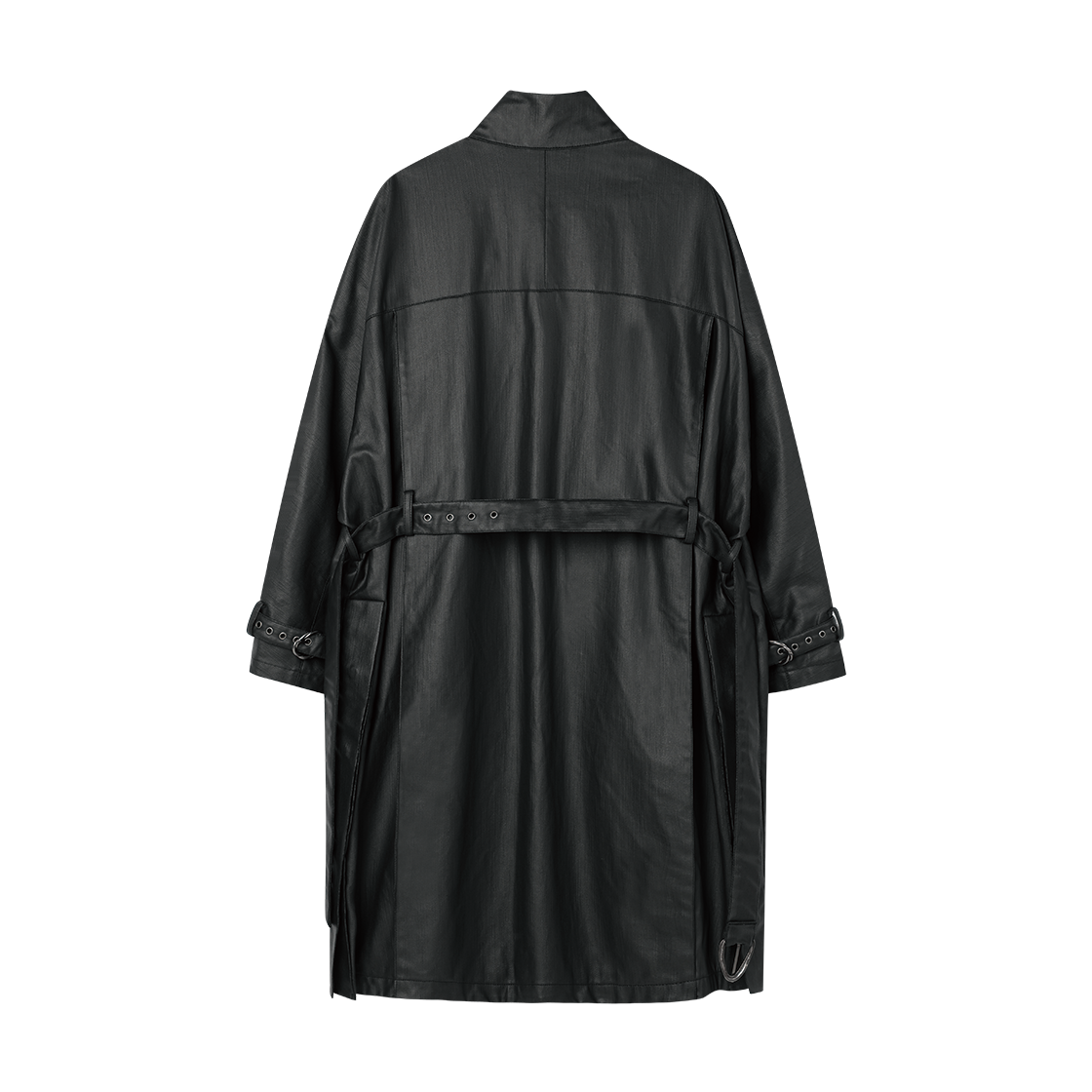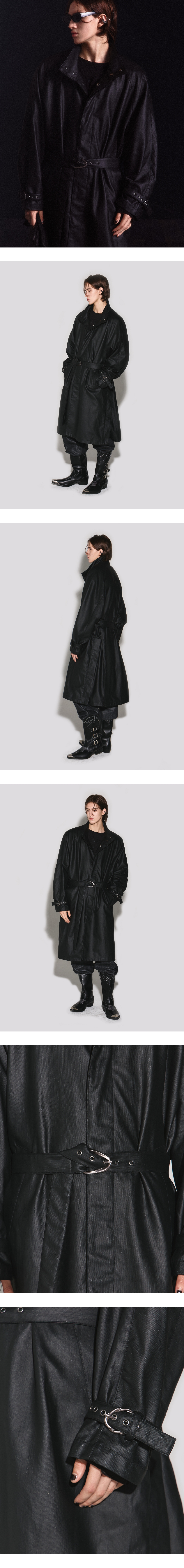 - 오버사이즈 핏 블랙 데님 트렌치 코트 - 독특한 슬라브 패턴의 코팅 데님 사용 - 스탠드 카라와 히든 스냅 버튼 앞 여밈 - 등판 깊은 플래쉬, 히든 스냅 버튼 사이드 벤트 - 흑니켈 컬러, 독특한 문양의 금속 버클 사용 - 소매 안쪽 지퍼와 벨트를 활용한 다양한 스타일링 - 외부 포켓 2개, 내부 수납 포켓 4개, 블랙 안감 처리 - DRY CLEAN ONLY