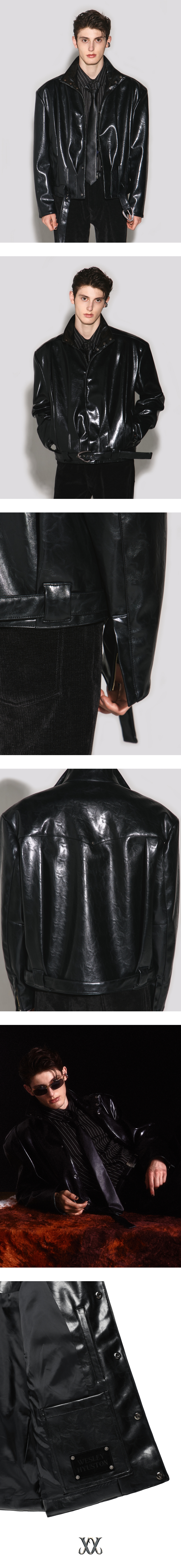 - 은은한 광택감의 오버 핏 레더 자켓 - 스탠드 카라와 히든 스냅 버튼 여밈 - 앞판 여러 개의 깊은 턱과 입술 포켓 - 등판 웨스턴 요크 절개와 깊은 사이드 턱 - 소매 뒤쪽 다트와 하단 지퍼 트임 디테일 - 흑니켈 컬러, 독특한 문양의 밑단 금속 버클 - 어깨 실루엣을 살려주는 패드 부자재 사용 - 내부 수납포켓 4개와 스웨이드 텍션지 마감 - DRY CLEAN ONLY
