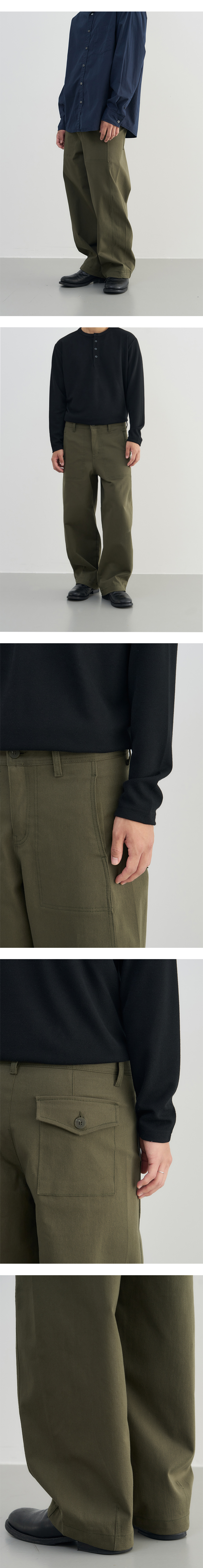 부드러운 터치감의 프리미엄 코튼/스판 소재를 활용하여 편안한 착용감과 트렌디한 실루엣에 초점을 맞춘 제품으로 오랜 기간 다양한 코디에 범용성 높게 활용하실 수 있습니다. · 군용 바지에서 착안한 퍼티그 포켓 디자인 · 볼륨감과 트렌디한 실루엣을 위해 앞쪽 절개 디테일을 활용 · 소재 특유의 탄성으로 흐트러짐 없이 자연스레 떨어지는 소재감 · 적절히 여유 있는 트렌디한 와이드 벌룬핏 실루엣