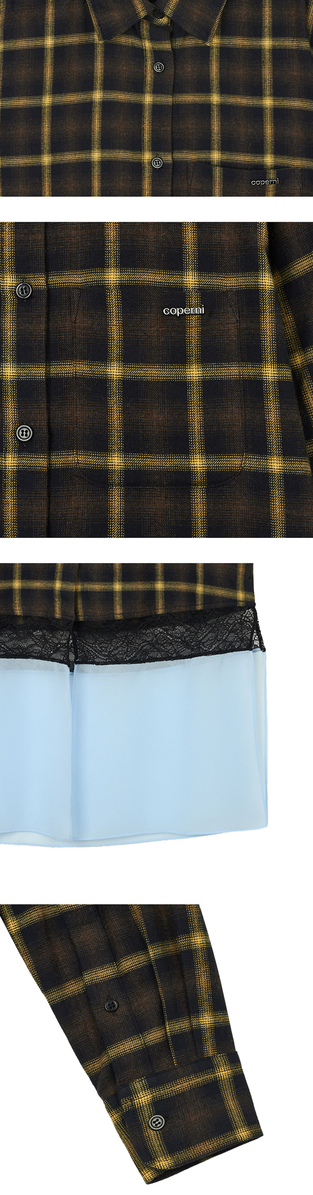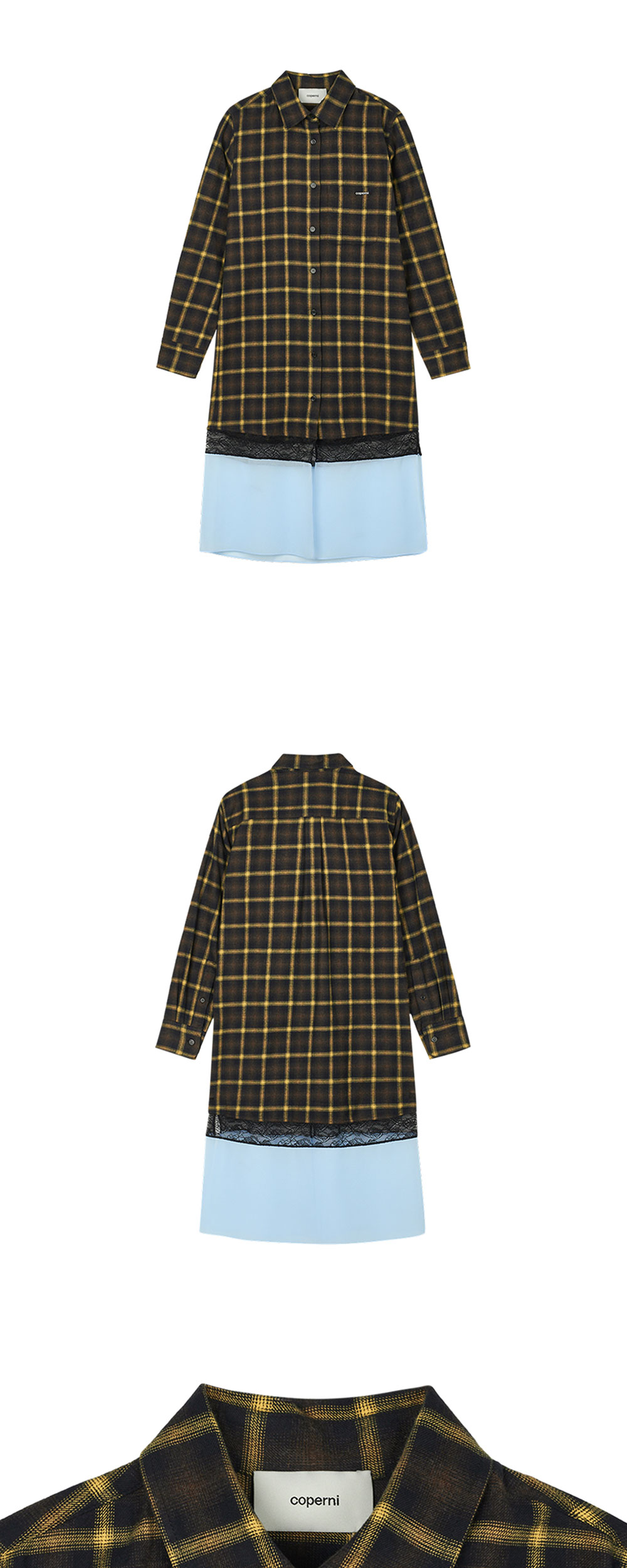 코페르니 우먼 멀티 레이어 셔츠 드레스 브라운 블루입니다. - 무릎 기장의 체크 원피스 - 비신축성의 가벼운 플란넬 소재 - 밑단의 레이스와 쉬폰 트림 - 로고가 달린 패치 포켓