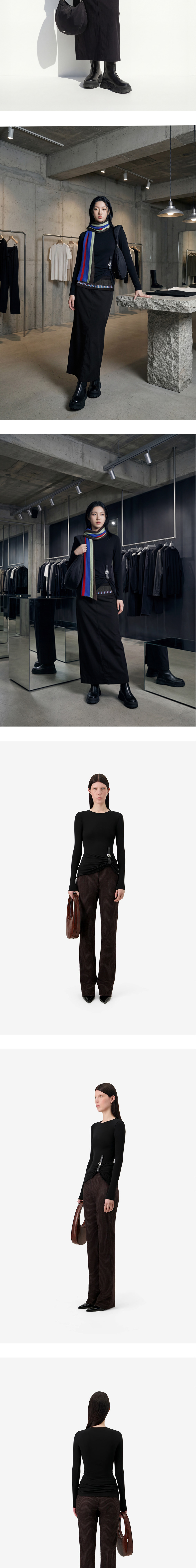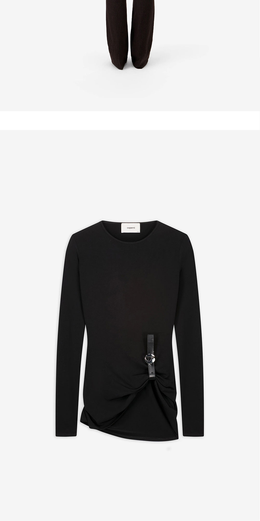 코페르니 우먼 서스펜디드 탑 블랙입니다. - 셔링 구조의 롱슬리브 탑 - 실버톤 링 버클 장식 디테일 - 부드럽고 탄력 있는 져지 소재 - 미니멀한 디자인과 테크니컬한 포인트의 조합 ✧ AI로 제작한 콘텐츠가 포함되었습니다.