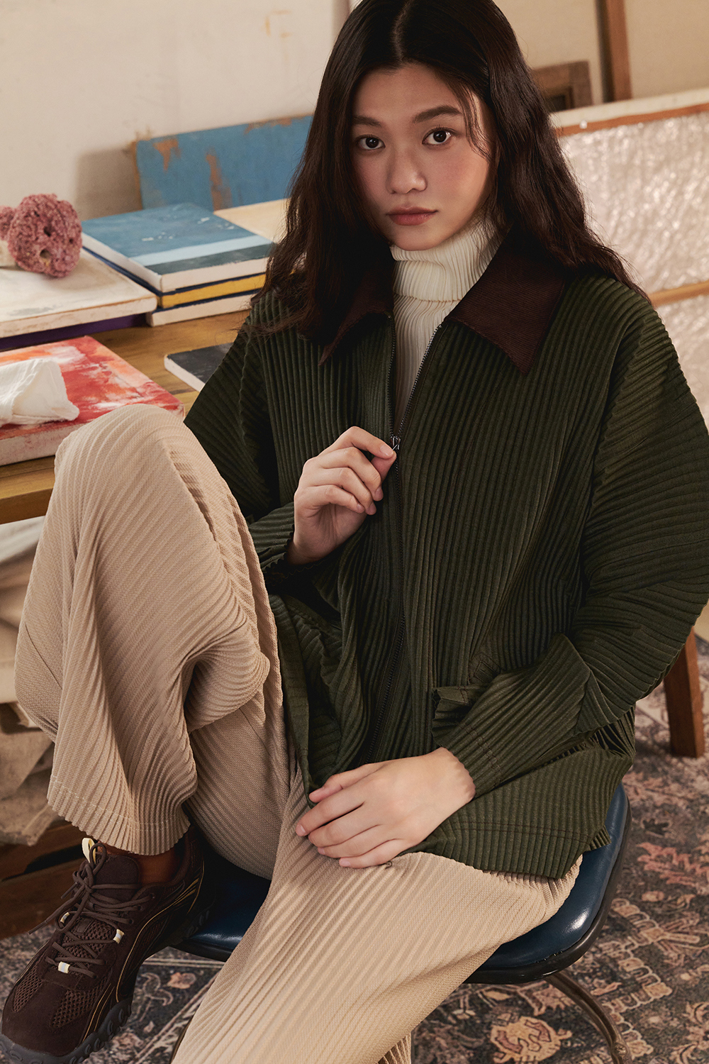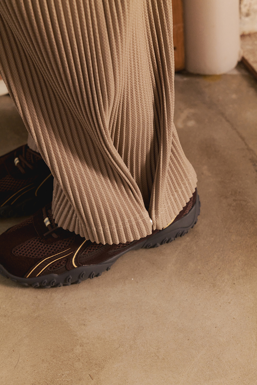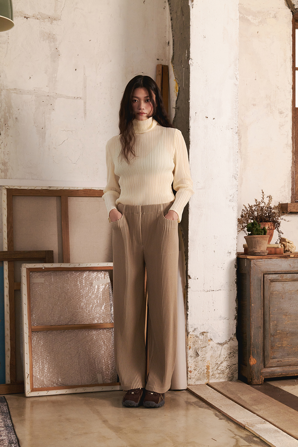 몽플리쎄 여성 밑단 스냅 투웨이 플리츠 스트레이트 팬츠 베이지