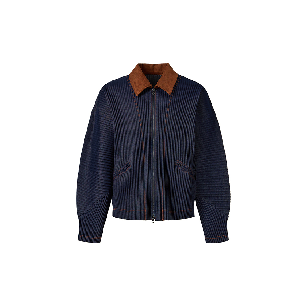 Monplisse Unisex Coduroy Collar Denim Bomber Pleats Jacket Navy