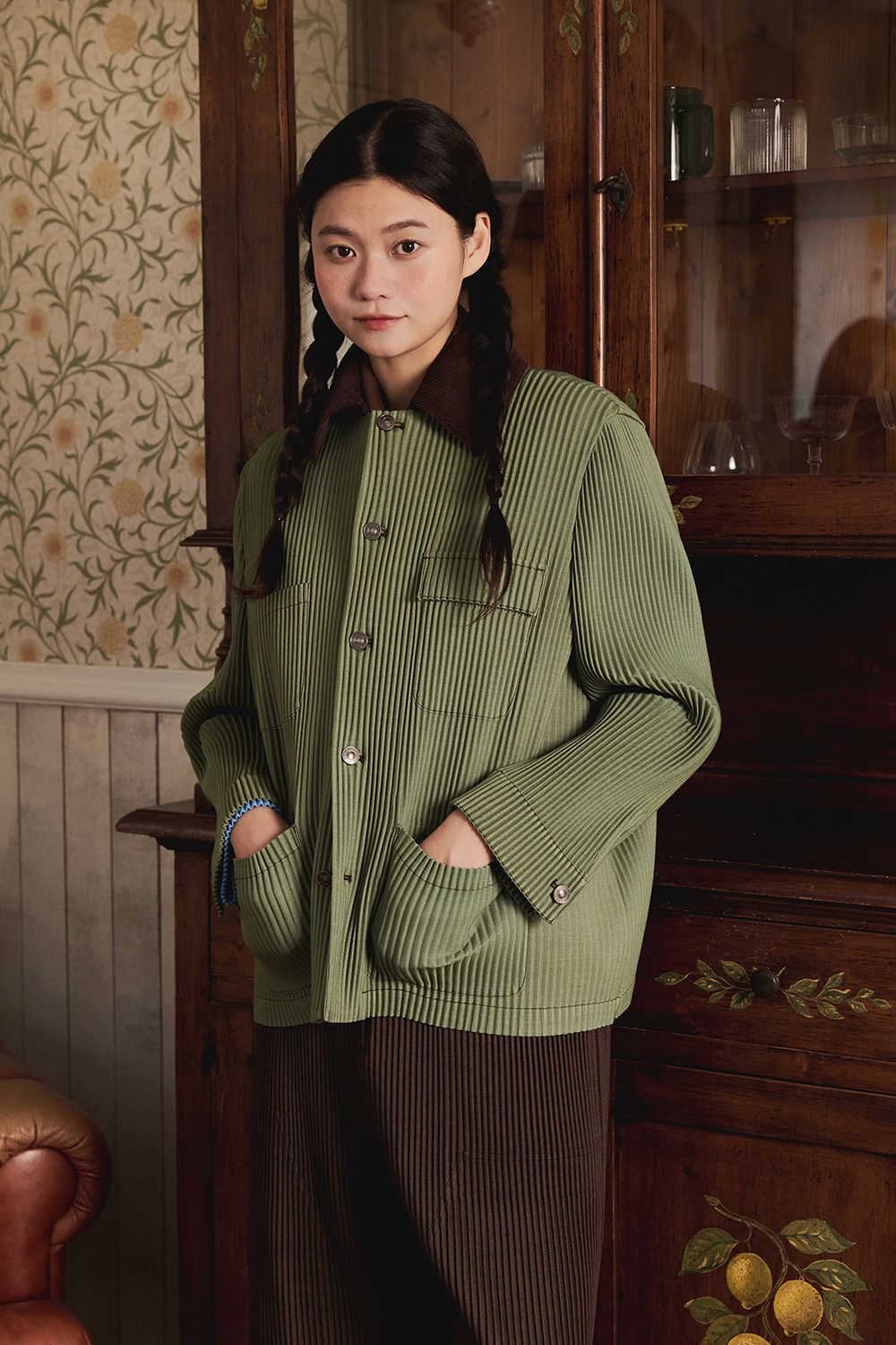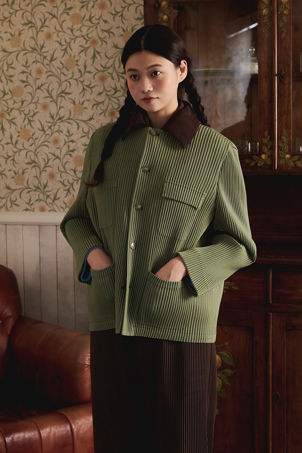 Monplisse Unisex Coduroy Collar Liner Pleats Work Jacket Khaki