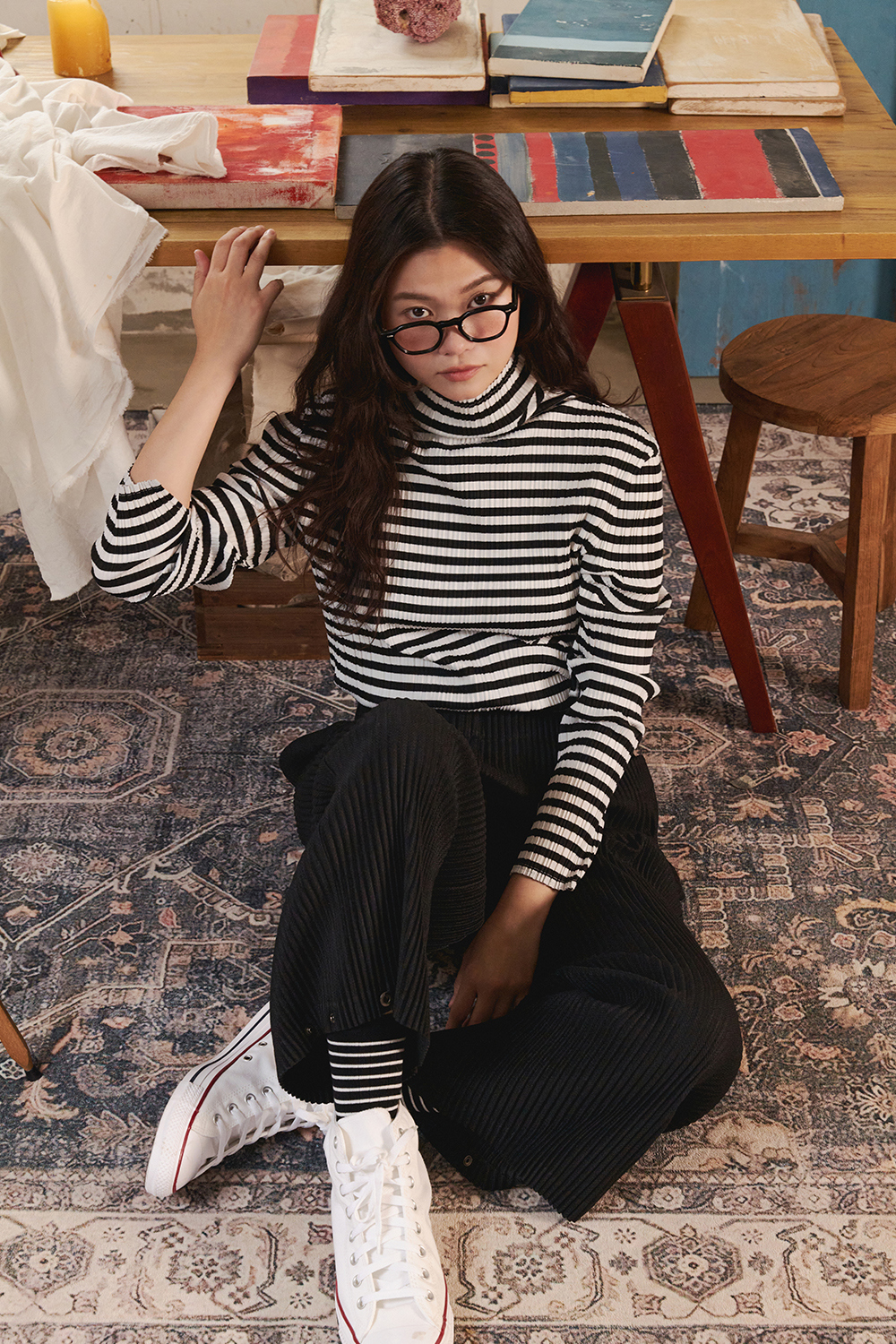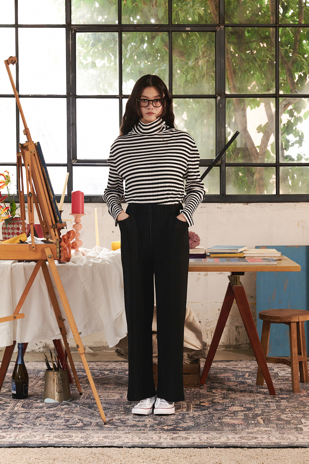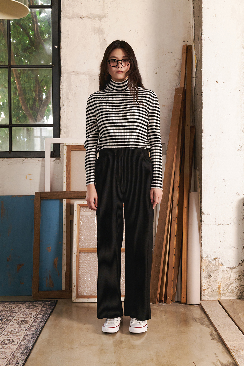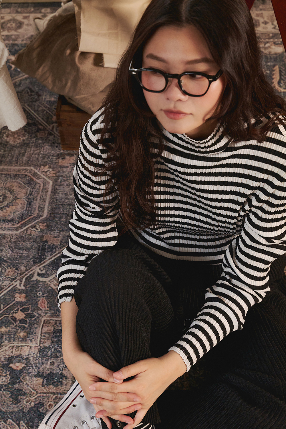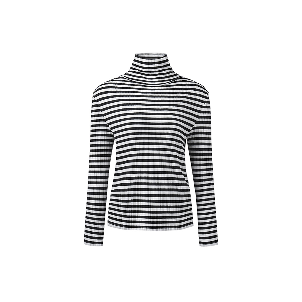 몽플리쎄 여성 저지 스트라이프 하이넥 플리츠 티셔츠 블랙