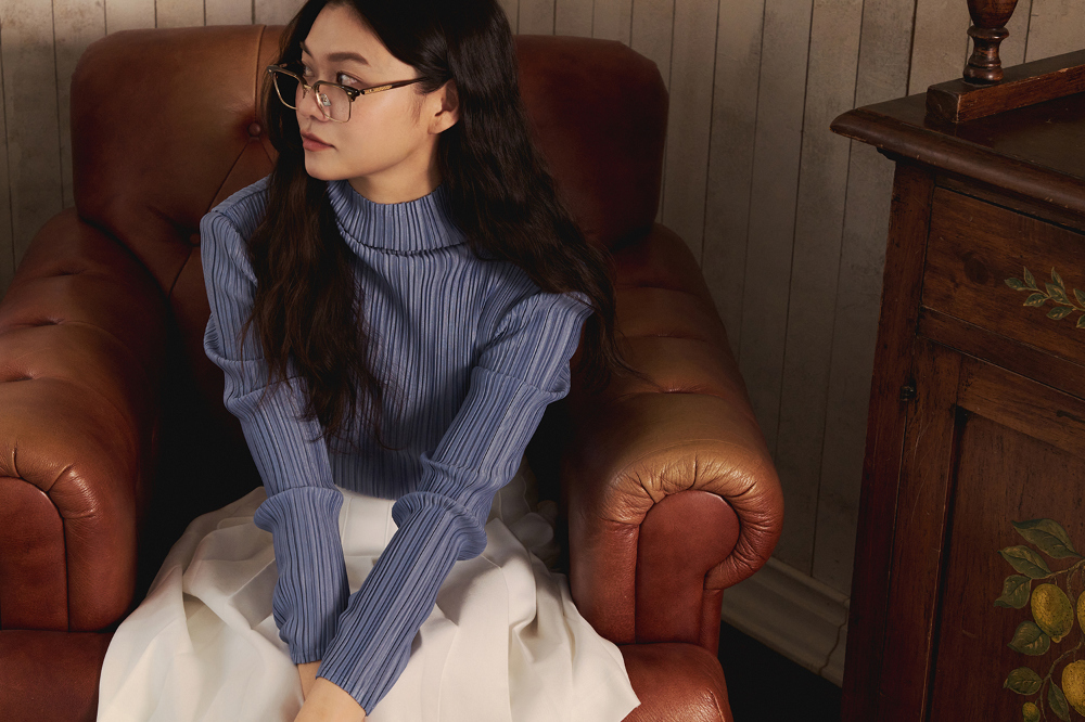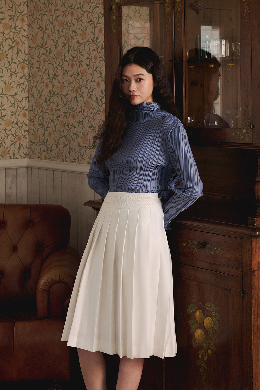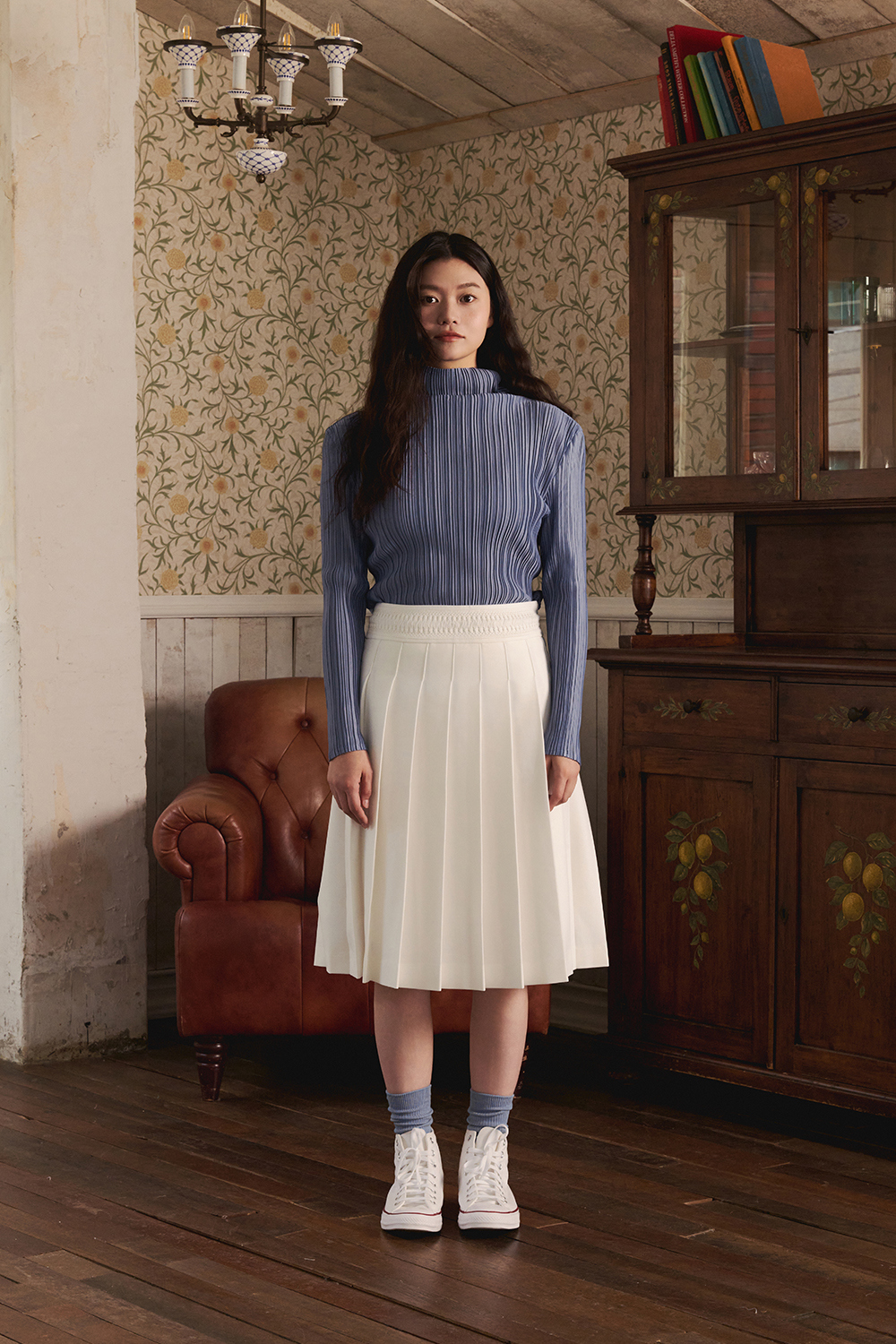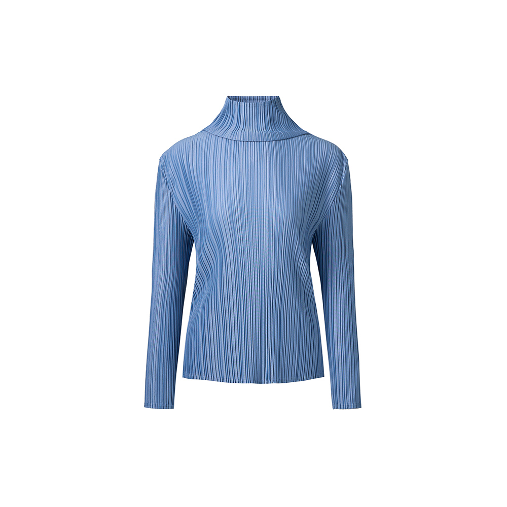 몽플리쎄 여성 하이넥 긴소매 폴라 플리츠 티셔츠 블루
