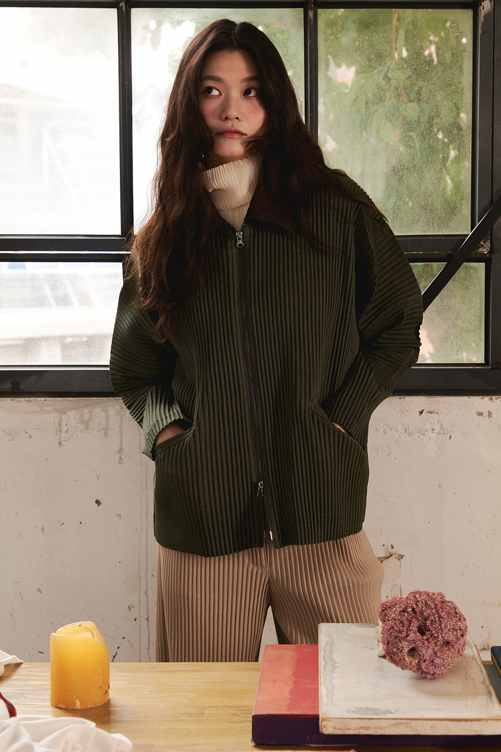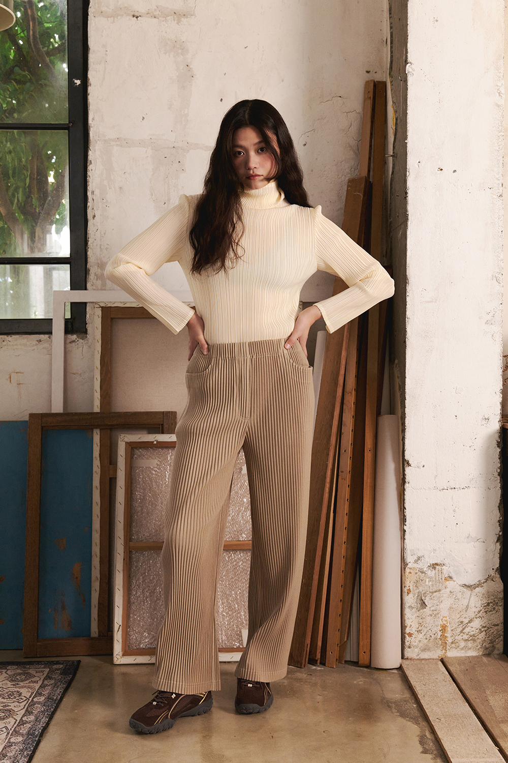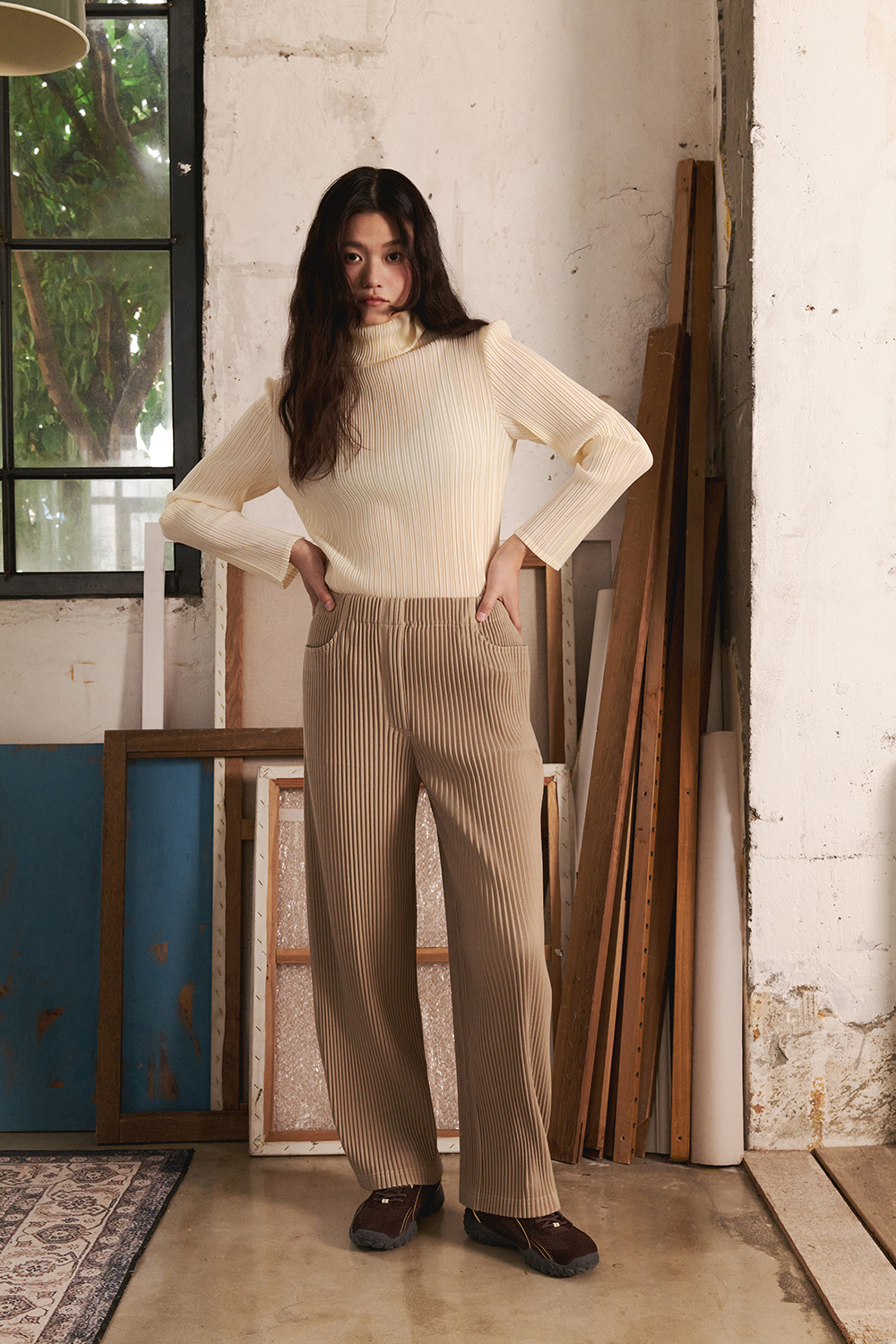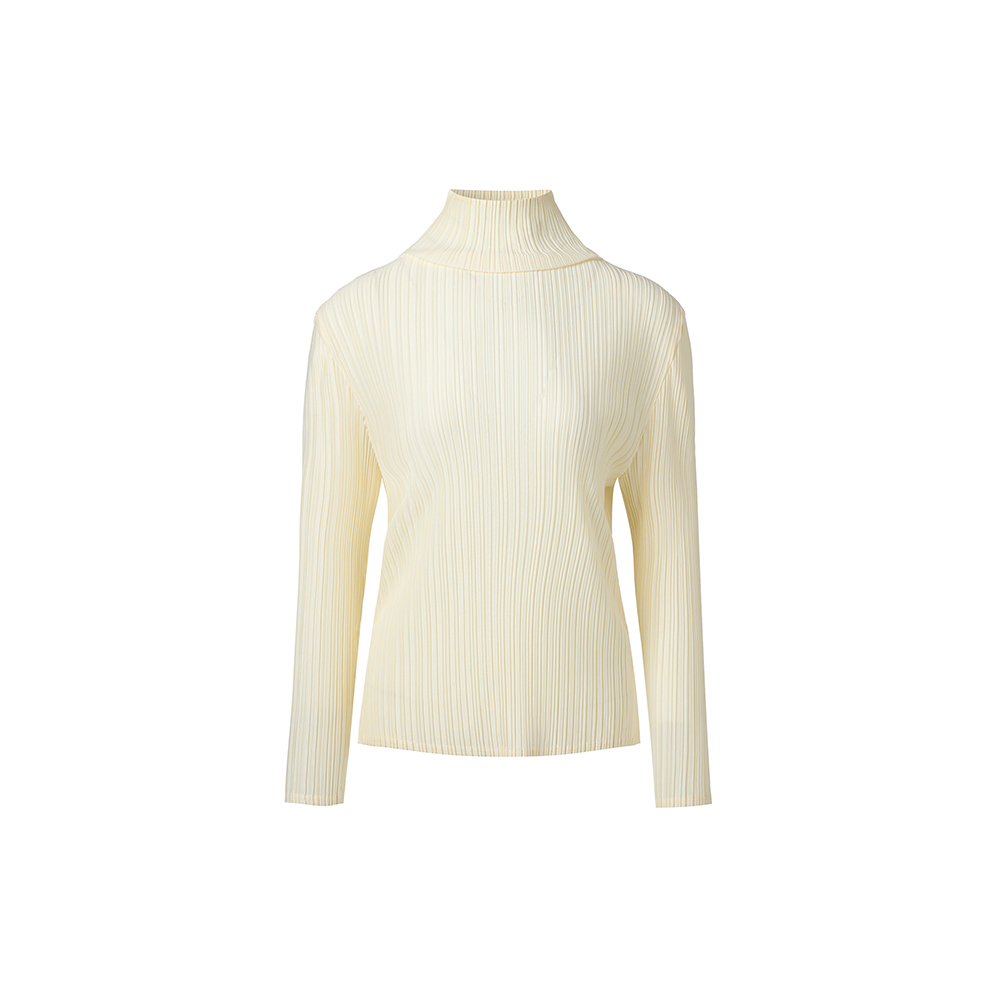 몽플리쎄 여성 하이넥 긴소매 폴라 플리츠 티셔츠 아이보리