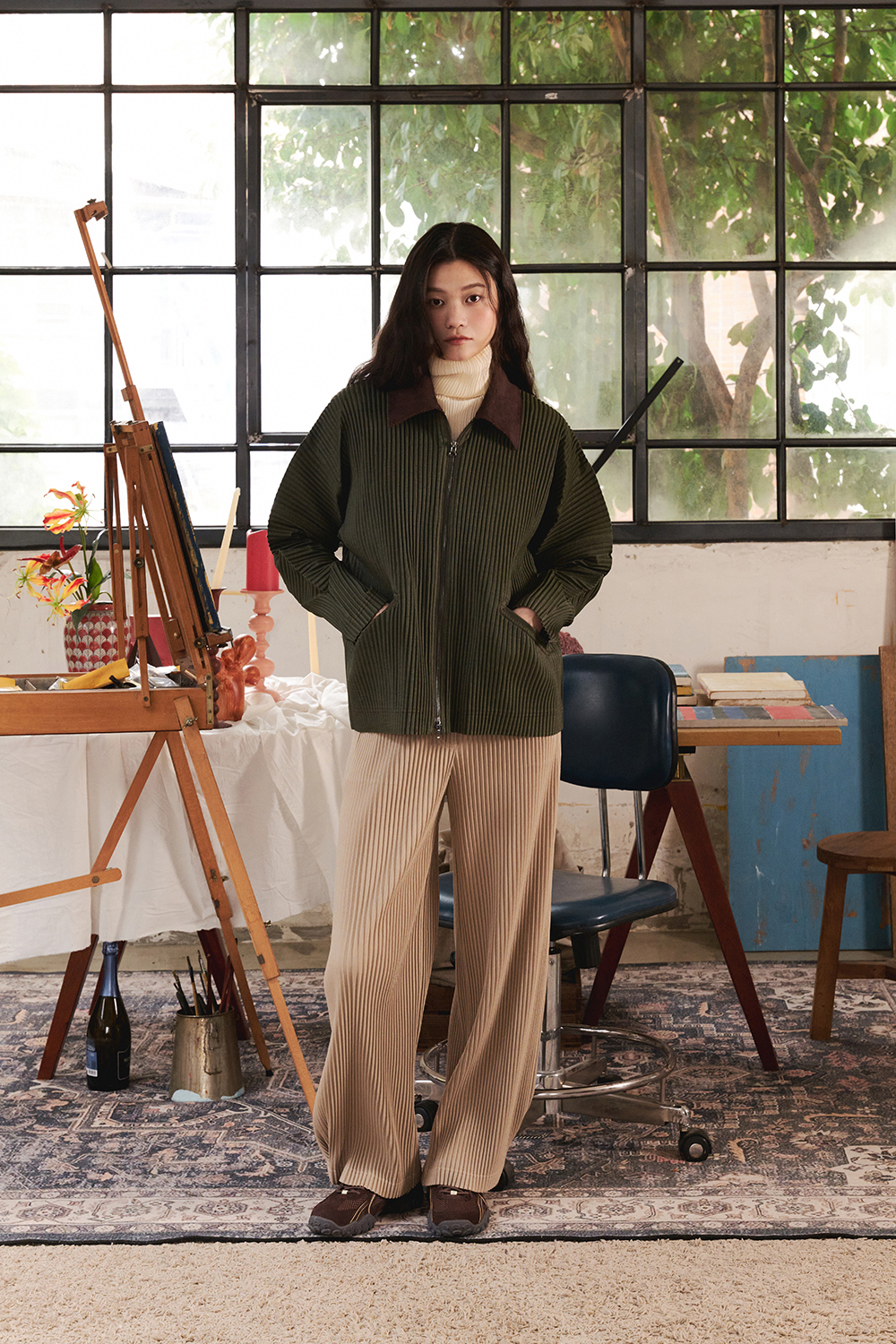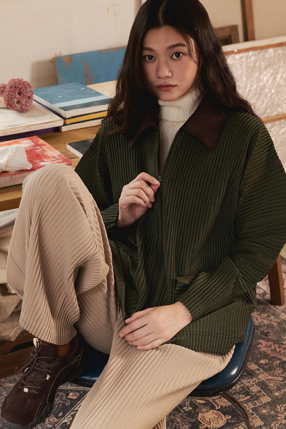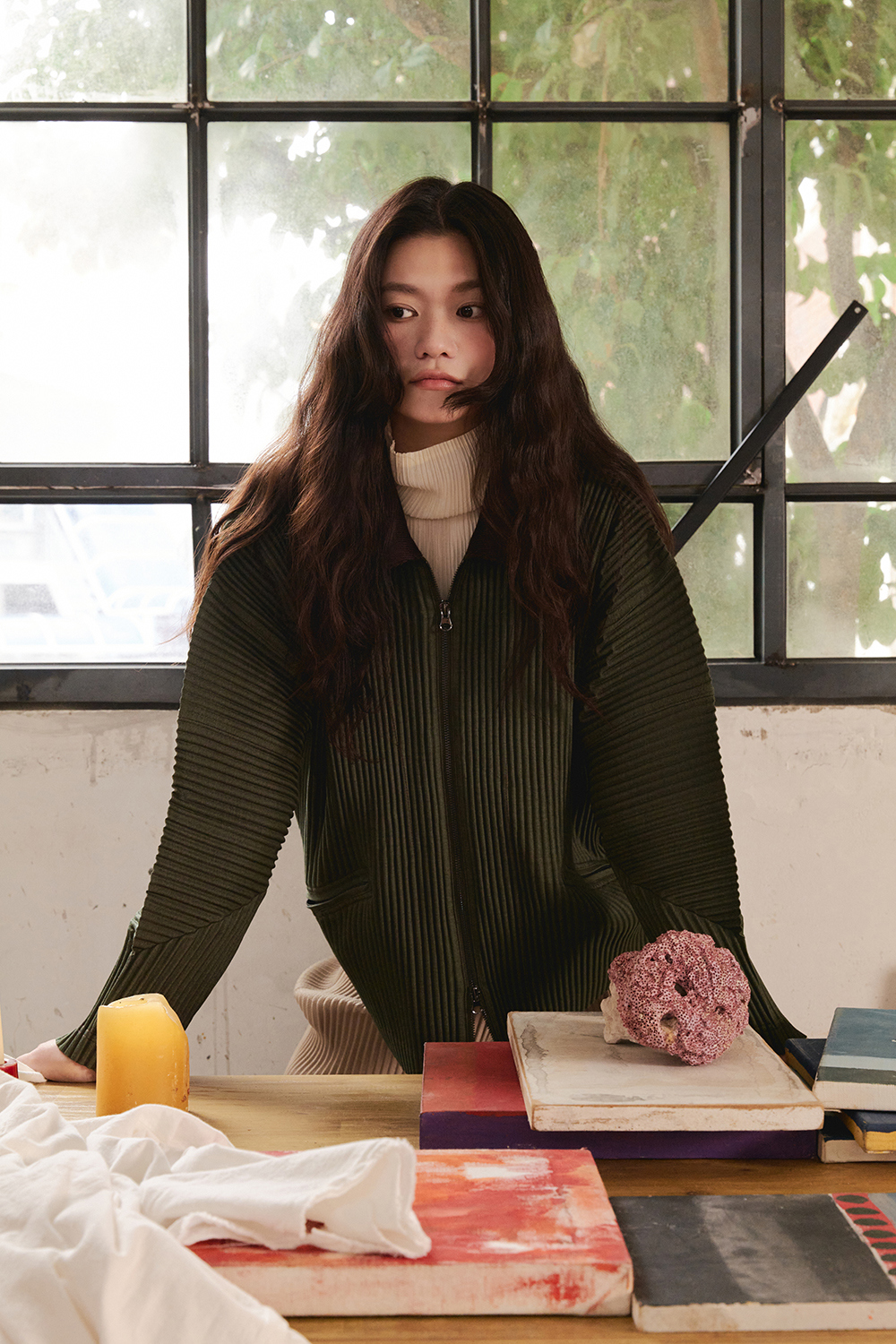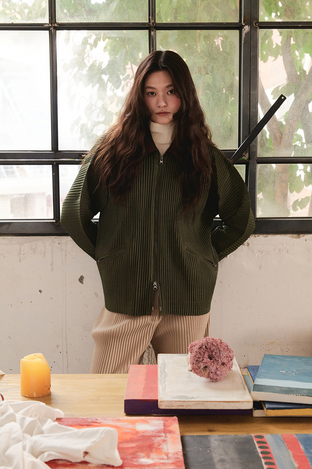 몽플리쎄 여성 하이넥 긴소매 폴라 플리츠 티셔츠 아이보리