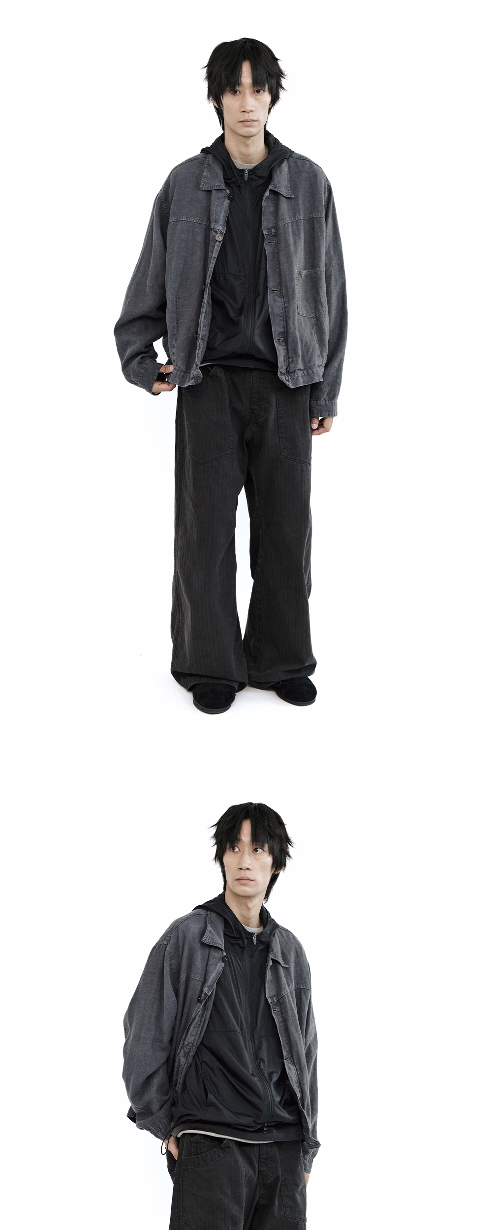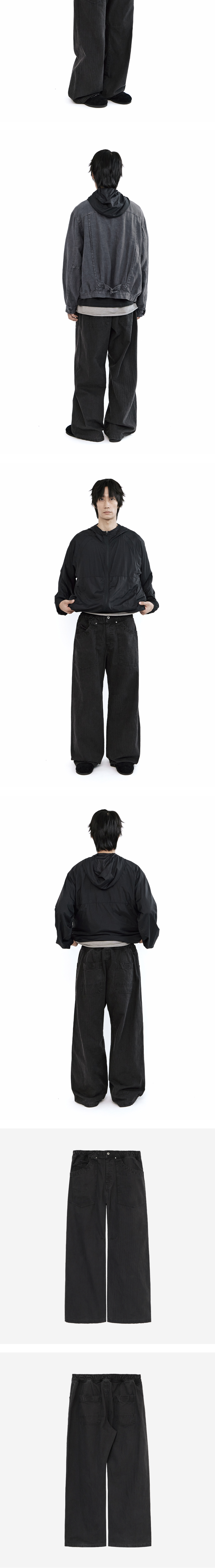 human baker pajama - charcoal, purple - 베이커 팬츠를 변형한 디자인 - 여유로운 실루엣 - 옅은 스트라이프 조직감의 코튼 트윌 원단 - 전면 지퍼 플라이 - 우측의 코인 포켓 디테일 - 후면 2개의 벨크로 포켓 - 허리 밴딩 & 스트링으로 편하게 착용 가능 *모델: 170 중반, 마른 체형 / 3사이즈 착용 *일반 체형 기준 - 170cm 초반 이하 2사이즈 권장 - 170cm 중반 3사이즈 권장 - 170cm 후반~180cm 초반 4사이즈 권장
