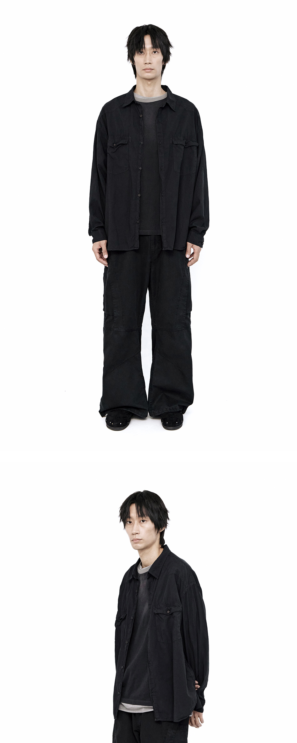 loosed tenco western shirts - black, dark purple navy - 많은 사랑을 받은, 텐코 셔츠의 웨스턴 버전 - 러프한 분위기, 이와 대비되는 부드러운 터치감과 착용감 - 좁은 목둘레, 가까운 깃의 거리, 사선 벤트 등 주로 디테일 주변부에 해석 가미 - 후면 플리츠 및 턱 디테일 - 자연스러운 셔링 적용된 후면 요크 - 어깨 부분 웨스턴 패널 적용 - 전면 2개의 플랩 포켓 *모델: 170 중반 / 마른 체형, 3사이즈 착용 *디자인 의도에 맞게 착용하시려면 기존 폴리테루 제품과 동일한 사이즈를 선택하시는 것을 권장드립니다. *일반 체형 기준 - 170cm 초반 이하 2사이즈 권장 - 170cm 중반 3사이즈 권장 - 170cm 후반~180cm 초반 4사이즈 권장