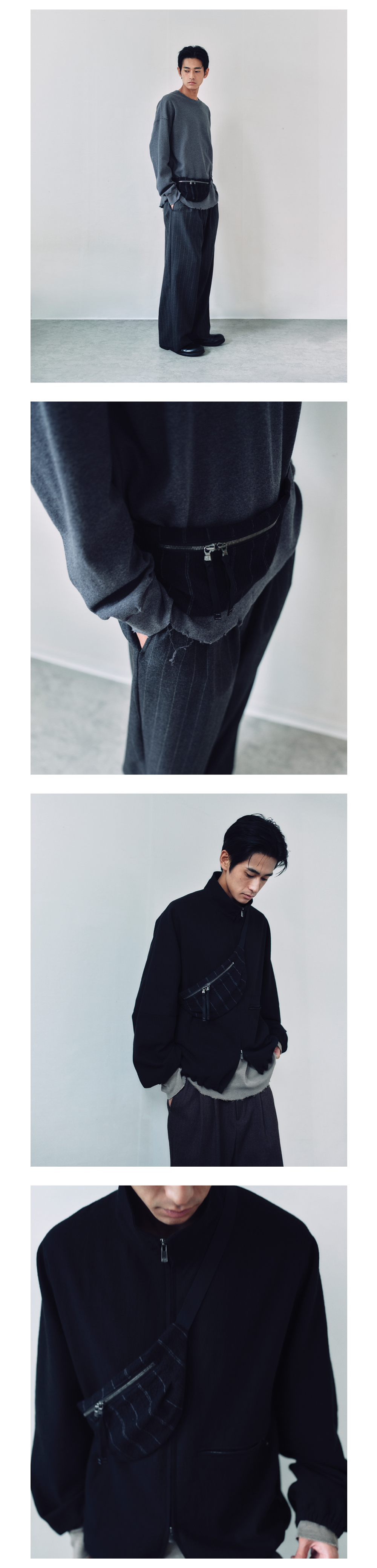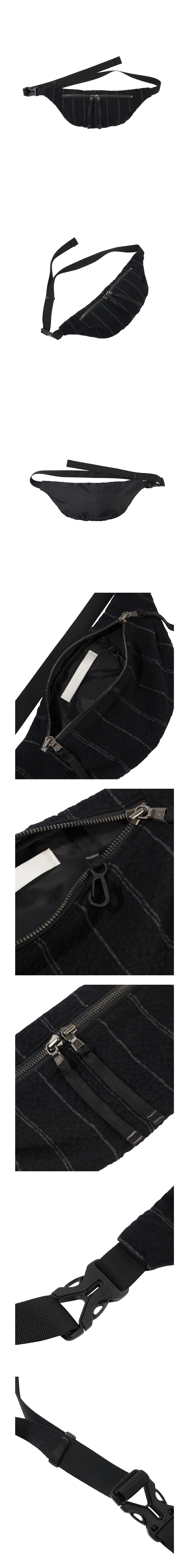 No. AY-BG01 입체적인 볼륨이 자연스럽게 형성된 웨이스트 백입니다. MATSUSEI社의 원단을 앞면에 사용하여 제작되었으며, 소재 특유의 질감과 온기감이 느껴집니다. 표면의 불규칙한 요철감은 ‘Dimple’이라는 이름처럼 미묘한 굴곡과 그림자를 만들어내며, 시간이 지날수록 형태가 부드럽게 변하고 손의 사용에 따라 표정이 달라집니다. 차분한 스트라이프 패턴이 고급스러우면서도 절제된 인상을 주며, 과도한 장식을 배제한 미니멀한 구조 속에서 소재 본연의 깊이를 강조했습니다. 메인 포켓에는 YKK社의 Excella 양방향 지퍼를 적용하여 실용성을 높였고, 벨트 스트랩은 조절이 가능하여 다양한 연출이 가능합니다. MADE IN KOREA Color Black Material Shell 1 : Cotton 73%, Wool 27% (MATSUSEI社 Japanese Fabric) Shell 2 : Nylon 100% Lining : Polyester 100%