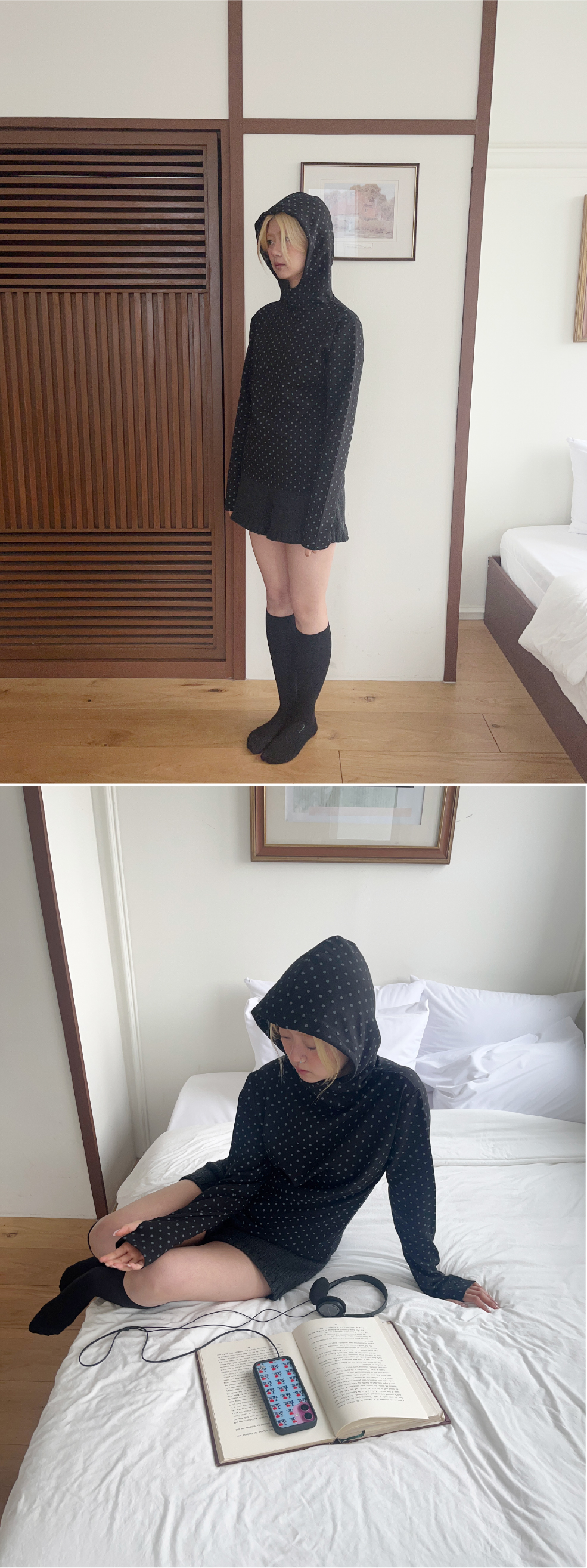 전체적으로 폴카도트 나염작업이 된 FW시즌 핑거홀 후드입니다. 기존 후드와는 다르게 조금 더 두툼한 두께와 전면 자수디자인을 제거하여, 보온성과 더불어 미니멀한 무드에 더 가깝게 제작하였습니다. COTTON 100% (SPAN) *직조방식의 패턴이 아닌, 원단위에 프린팅으로 입혀진 패턴입니다. 그 위에 봉제 또는 자수가 들어가기 때문에 봉제가 많이 들어간 부분은 간혹 크랙과 같은 느낌을 받으실 수 있습니다만, 불량이 아닌 자연스러운 현상임을 알려드립니다.