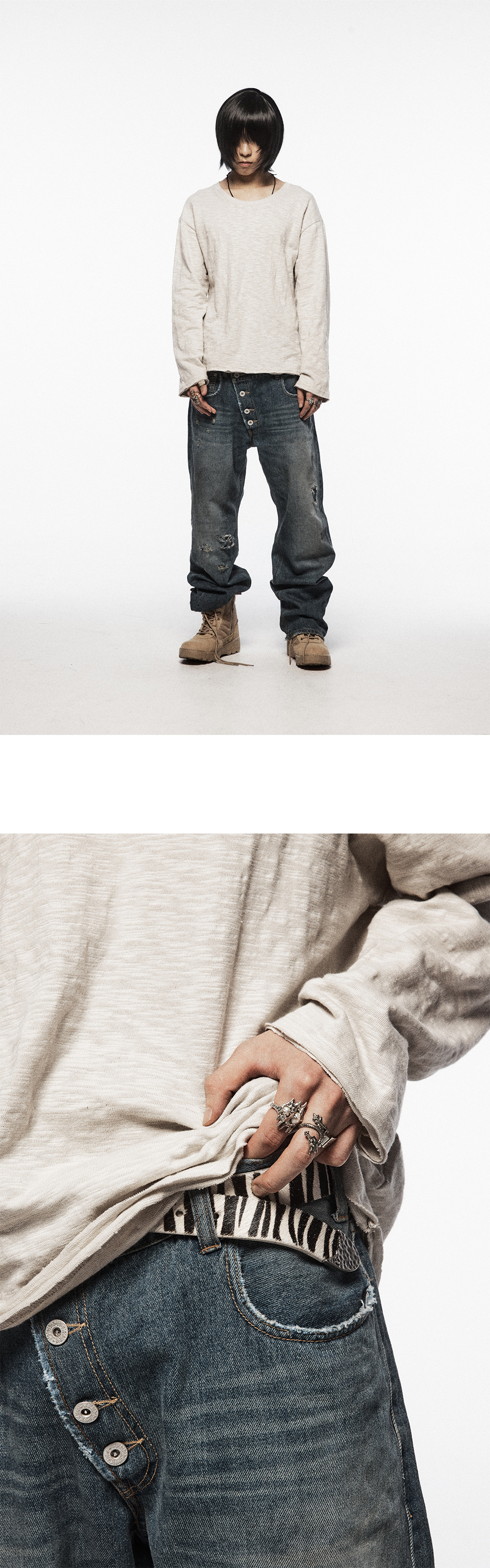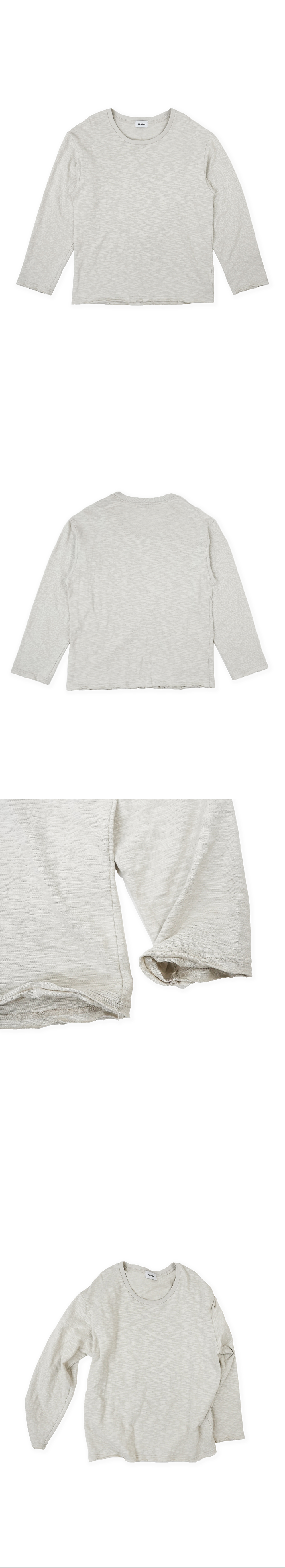 - 슬럽 16수 면 원단 - 소매 끝, 밑단 절개 디테일 - 여유로운 핏 - 넓고 깊은 넥 라인 - 좁은 립 폭