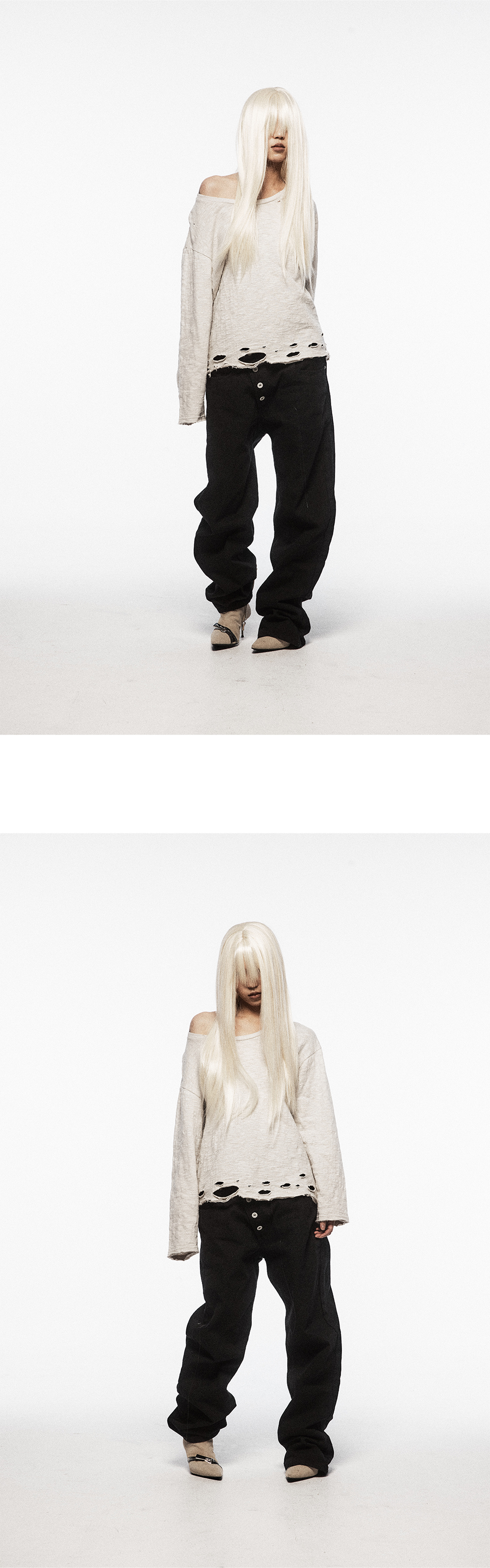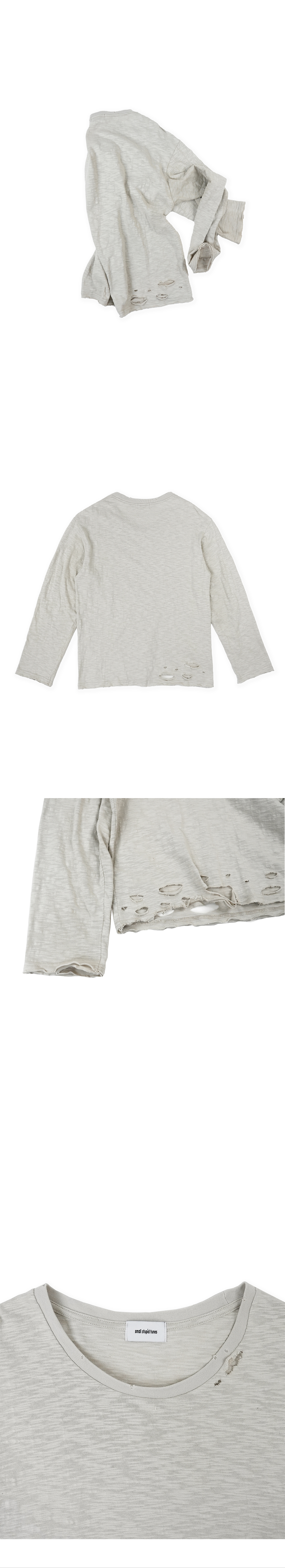 - 슬럽 16수 면 원단 - 넥, 립, 밑단 디스트로이드 디테일 - 소매 끝, 밑단 절개 디테일 - 여유로운 핏 - 넓고 깊은 넥 라인 - 좁은 립 폭