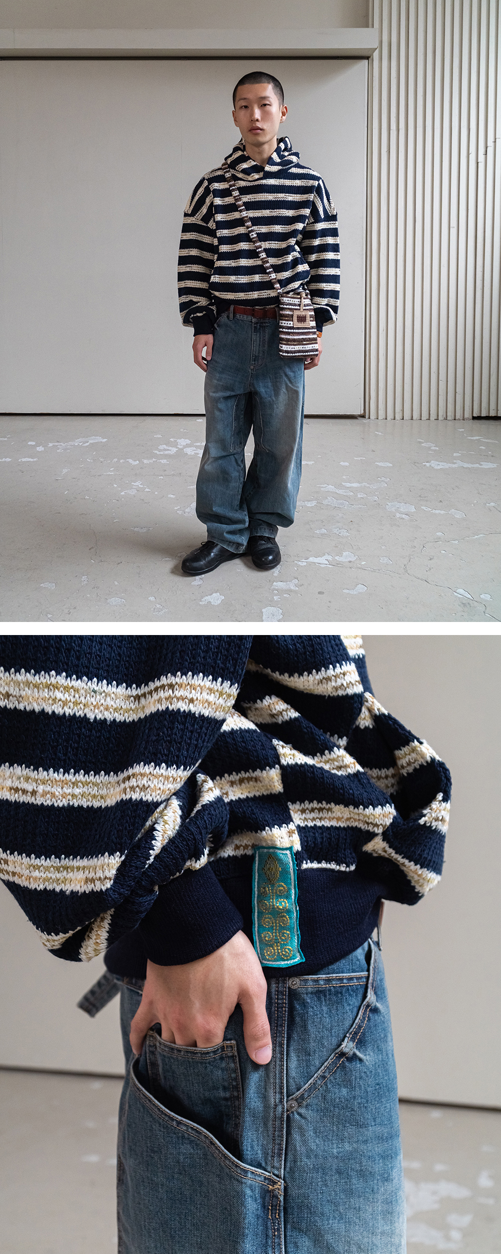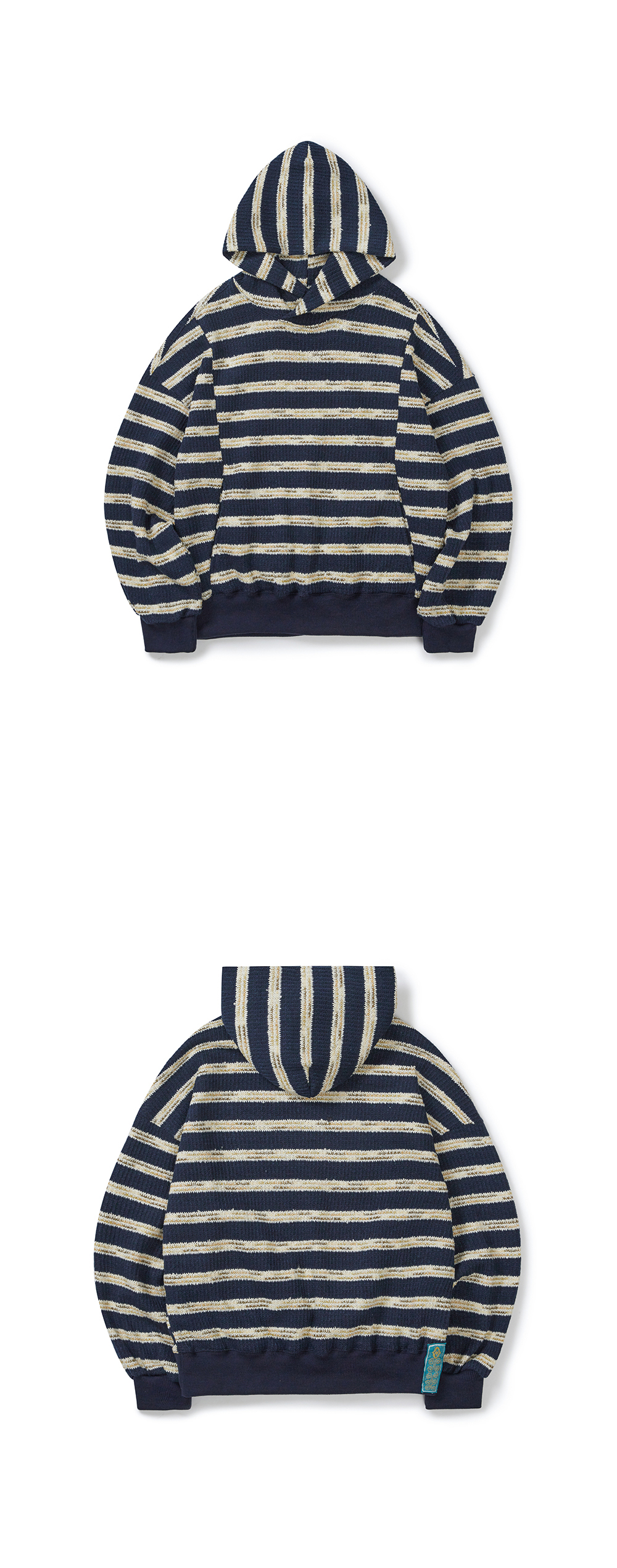 Product Info. - 고품질 울 혼방 소재로 제작된 스트라이프 니트 후드 티셔츠 - 여유로운 착용감의 릴렉스드 핏 실루엣 - 감각적인 언밸런스 패널 디자인 - 패턴 구조를 활용한 절개 포켓 - 감싸는 형태의 후디 네크라인 - 후면 하단부 린넨 소재의 자수 라벨 포인트 *MODEL 173cm, wearing size 00