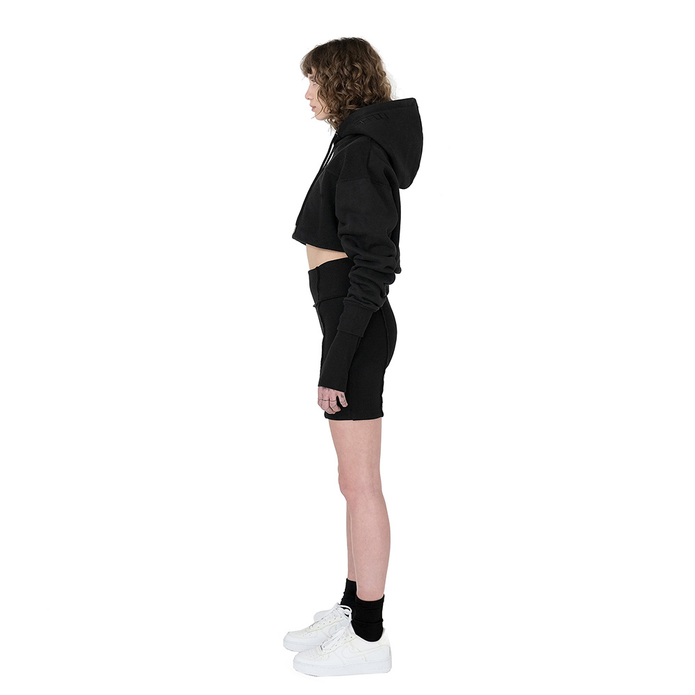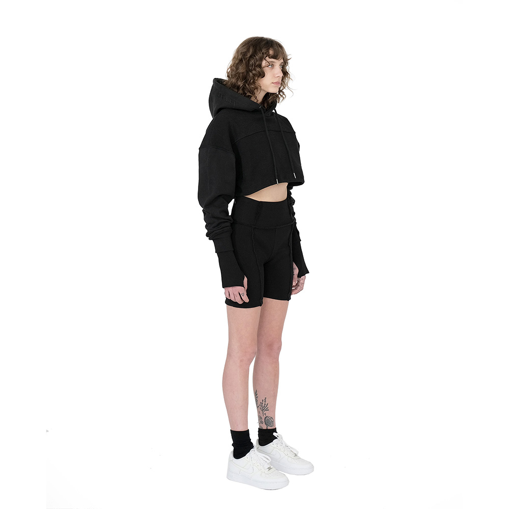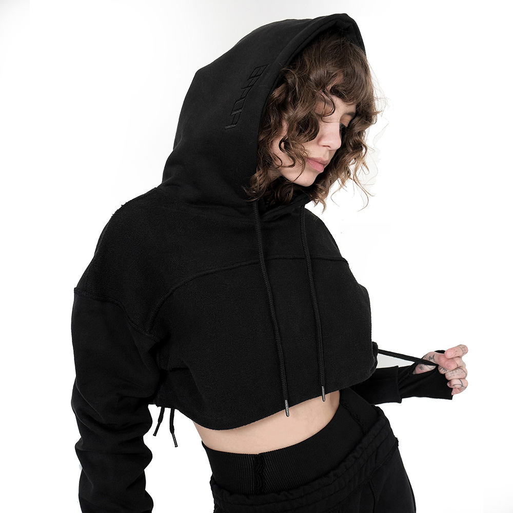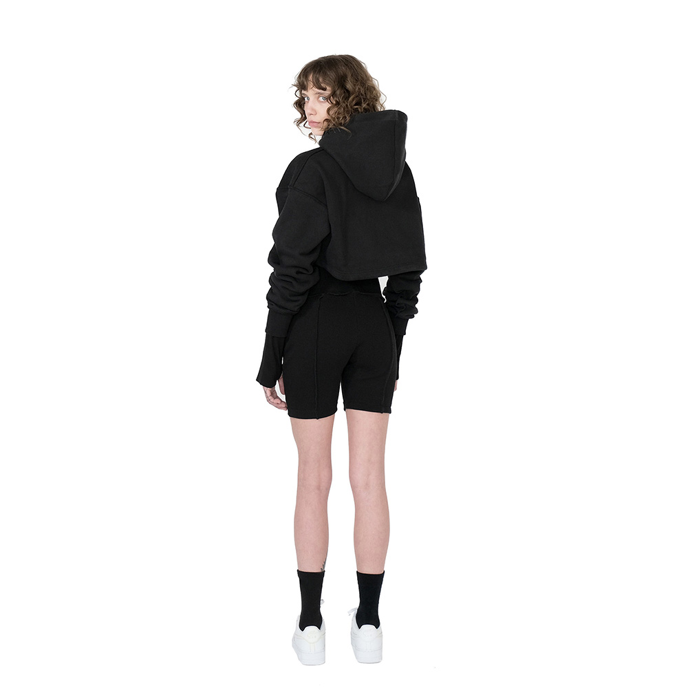 Oversized reversible cropped hoodie. Front panel fabric used inside-out. Logo embroidery on both sides of the hood in the same tone as the fabric. Adjustable drawstrings at the hem of the hoodie. Thumb holes on sleeve ribs.