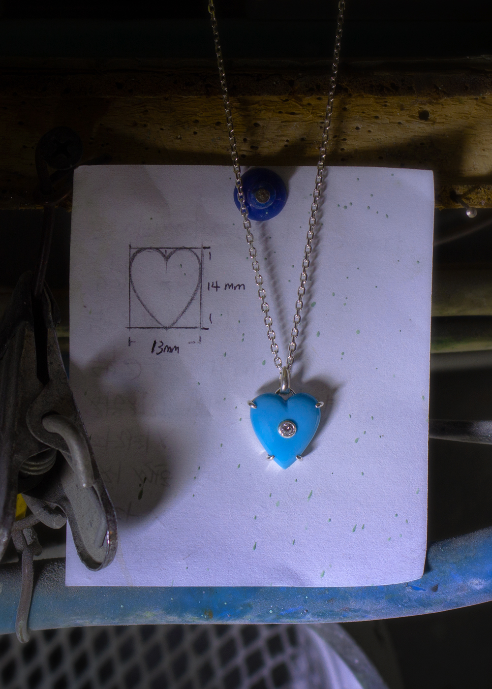 · 상품명 : Heart Turquoise Point Necklace (M) · 소재 : 925실버, 터키석 · 사이즈 : 팬던트 12.5*14mm, 체인 420+40mm, 터키석 12.5*14mm [Material Note · Turquoise] 이 목걸이에 사용된 터키석은 무늬와 결점이 없는 면만을 선별해 제작되었습니다. 자연 터키석은 대부분 다양한 컬러와 터키석 특유의 결이 함께 형성되며, 균일한 색을 가진 부분은 원석 전체에서 극히 제한적입니다. 이 면만을 사용하기 위해 하나의 원석 중 일부만 채취되며, 그 과정에서 상당한 로스가 발생합니다. 표면이 지나치게 깔끔해 보일 수 있으나, 이는 인공 소재가 아닌 자연석 중에서도 가장 균질한 부분만을 사용했기 때문입니다. 무늬보다 색의 밀도와 완성도를 기준으로 선별한 희소한 터키석입니다.